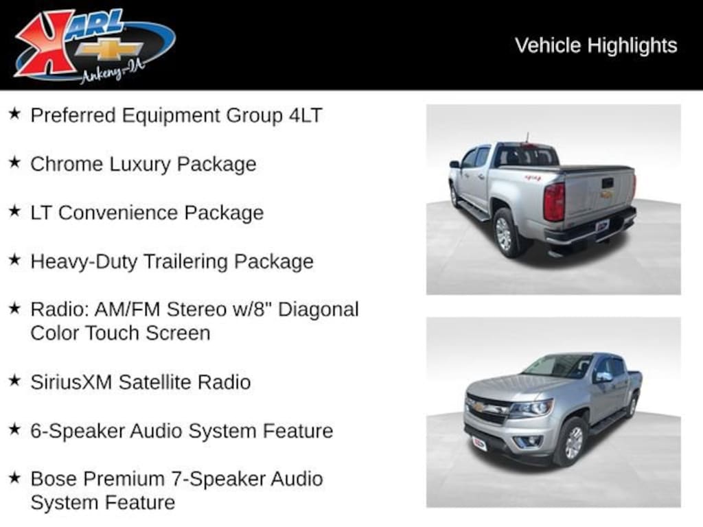 CARFAX One-Owner, Local Trade & Sold New at Karls! Equipped With Running Boards, Mud Flaps, Bed Linre & Tonneau Cover! Clean CARFAX. Certified. Silver Ice Metallic 2017 Chevrolet Colorado LT 4WD CREW CAB 128.3 V6 4WD, 4-Way Power Front Passenger Seat Adjuster, 6-Speaker Audio System Feature, Alloy wheels, Apple CarPlay, Bose Premium 7-Speaker Audio System Feature, Chrome Door Handles, Chrome Luxury Package, Exterior Parking Camera Rear, EZ-Lift & Lower Tailgate, Front Fog Lamps, Heated Driver & Front Passenger Seats, Heavy-Duty Trailering Package, Inside Rear-View Auto-Dimming Mirror, LT Convenience Package, Manual Rear-Sliding Window, Outside Heated Power-Adjustable Chrome Mirrors, Power Driver Lumbar Control Seat Adjuster, Power driver seat, Power Passenger Lumbar Control Seat Adjuster, Preferred Equipment Group 4LT, Projector-Type Headlamps, Radio: AM/FM Stereo w/8 Diagonal Color Touch Screen, Rear Chrome Bumper, Rear-Window Electric Defogger, Remote Vehicle Starter System, Single-Zone Auto Climate Control Air Conditioning, SiriusXM Satellite Radio. 17/24 City/Highway MPG 8-Speed Automatic 4WDAt Karl Chevrolet we want to help you find the best new or used car in Ankeny that suits your needs. Check out the 2017 Chevrolet Colorado For Sale in Ankeny, IA. When you buy a new car at Karl Chevrolet you know you're finding a vehicle you can rely on. We have a great selection of Platinum Quality Pre-Owned Vehicles. We also pride ourselves in creating a friendly atmosphere and reliable new car dealership that you can trust. Call us with any questions about our 2017 Chevrolet Colorado and our experts will be glad to help you! (515) 299-4300. *Equipment and options are generated by a 3rd party vendor, exact vehicle options may vary. Please see a salesperson for complete details and vehicle information.Certification Program Details: Karl Chevrolet of Ankeny, your newest CarBravo dealer, where platinum quality vehicles and unmatched benefits come together! -Comprehensive Limited Bumper to Bumper Warranty. -24/7 Roadside Assistance: -Multi-Point Vehicle Inspection: Every vehicle undergoes a Platinum Quality Certified Inspection known throughout the industry to ensure top quality. -Vehicle Exchange Program. Within 10-Days and 500 miles -Complimentary Vehicle History Report -Nationwide Dealer Network Support: Enjoy the backing of the extensive CarBravo and GM dealership network. -OnStar and SiriusXM Trials: Enjoy connected services and entertainment with included trial subscriptions. -Terms and conditions may apply. With every vehicle purchased, you'll enjoy the peace of mind that comes with a limited warranty, 24/7 roadside assistance, and a comprehensive vehicle inspection.