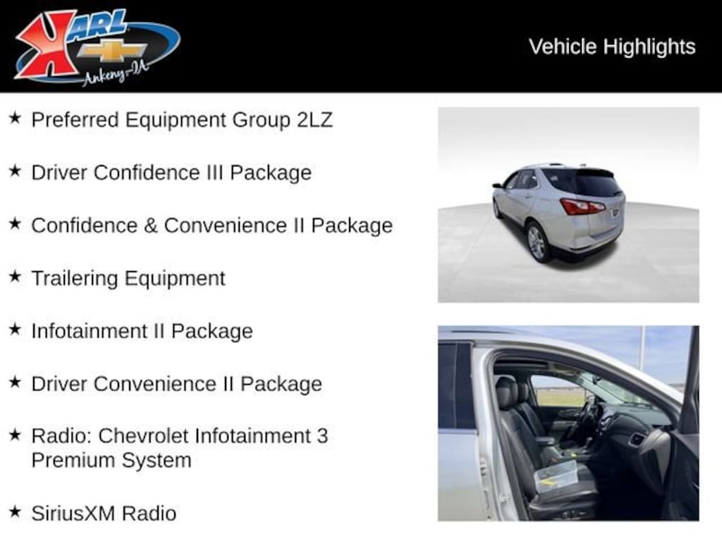 At Karl Chevrolet, we want to help you find the best new or used car in Ankeny that suits your needs. When you buy a new car at Karl Chevrolet, you know you're finding a vehicle you can rely on. We have a great selection of Platinum Quality Pre-Owned Vehicles. We also pride ourselves in creating a friendly atmosphere and a reliable Dealership that you can trust. Call us and our experts will be glad to help you! (515) 299-4300. *Equipment and options are generated by a 3rd party vendor, exact vehicle options may vary. Please see a salesperson for complete details and vehicle information.
