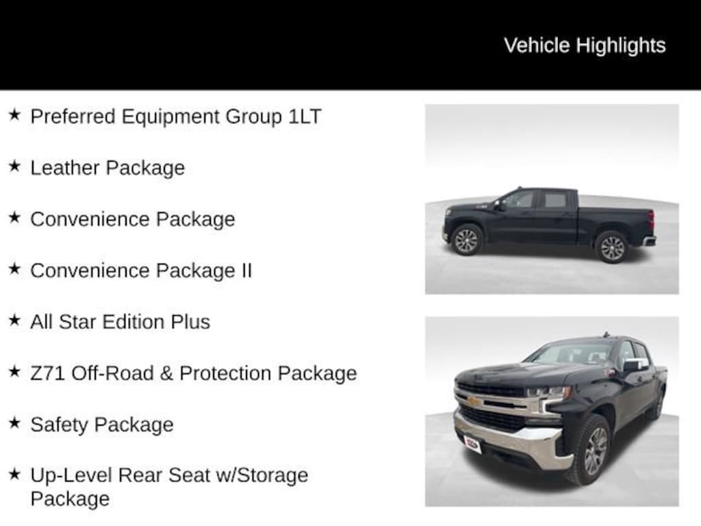 10-Way Power Driver Seat w/Lumbar, 12-Volt Rear Auxiliary Power Outlet, 120-Volt Bed Mounted Power Outlet, 120-Volt Instrument Panel Power Outlet, 2 USB Ports, 2 USB Ports (First Row), 4.2 Diagonal Color Display Driver Info Center, 4G LTE Wi-Fi Hot Spot Capable, Advanced Trailering Package, Advanced Trailering System, All Star Edition Plus, All-Star Edition, All-Weather Floor Liner (LPO) (AAK), Auto-Locking Rear Differential, Bed Protection Package, Bluetooth® For Phone, Chevrolet Connected Access Capable, Chevytec Spray-On Black Bedliner, Chrome Grille, Chrome Mirror Caps, Color-Keyed Carpeting Floor Covering, Compass, Convenience Package, Convenience Package II, Deep-Tinted Glass, Dual Exhaust w/Polished Outlets, Dual-Zone Automatic Climate Control, Electric Rear-Window Defogger, Electrical Lock Control Steering Column, Electronic Cruise Control, EZ Lift Power Lock & Release Tailgate, Front Frame-Mounted Black Recovery Hooks, Front Rubberized Vinyl Floor Mats, HD Radio, HD Rear Vision Camera, Heated Driver & Front Outboard Passenger Seats, Heated Steering Wheel, Heavy-Duty Air Filter, Hill Descent Control, Hitch Guidance, Hitch Guidance w/Hitch View, Keyless Open & Start, Lane Change Alert w/Side Blind Zone Alert, Leather Package, Leather Wrapped Steering Wheel, Leather-Appointed Front Seat Trim, LED Cargo Area Lighting, Manual Tilt/Telescoping Steering Column, Off-Road Suspension, OnStar & Chevrolet Connected Services Capable, Perimeter Lighting, Power Door Locks, Power Front Windows w/Driver Express Up/Down, Power Front Windows w/Passenger Express Down, Power Rear Windows w/Express Down, Power Sliding Rear Window w/Rear Defogger, Preferred Equipment Group 1LT, Radio: Chevrolet Infotainment 3 Plus System, Rear 60/40 Folding Bench Seat (Folds Up), Rear Cross Traffic Alert, Rear Dual USB Charging-Only Ports, Rear Rubberized-Vinyl Floor Mats, Rear Vision Camera, Rear Wheelhouse Liners, Remote Vehicle Starter System, Safety Package, SiriusXM Radio, SiriusXM w/360L, Standard Tailgate, Steering Wheel Audio Controls, Theft Deterrent System (Unauthorized Entry), Trailering Package, Ultrasonic Front & Rear Park Assist, Universal Home Remote, Up-Level Rear Seat w/Storage Package, Wheels: 18 x 8.5 Bright Silver Painted Aluminum, Wheels: 20 x 9 Painted Aluminum, Wireless Phone Projection, Z71 Off-Road & Protection Package, Z71 Off-Road Package.