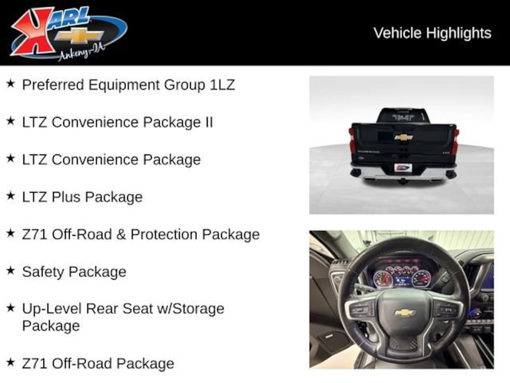 Certification Program Details: Karl Chevrolet of Ankeny, The Nation's #1 CarBravo certified dealer, where platinum quality vehicles and unmatched benefits come together! This vehicle qualifies for our CarBravo Certified program reserved for the highest-quality pre-owned vehicles that are 10 model years or newer and have less than 100,000 miles. Every CarBravo Certified vehicle includes: ? Comprehensive 126-Point Inspection Professionally inspected by factory-trained technicians to meet strict mechanical, safety, and cosmetic standards. ? 6-Month / 6,000-Mile Bumper-to-Bumper Limited Warranty Enjoy added peace of mind with extensive coverage from the day you drive off the lot. ? 24/7 Roadside Assistance & Courtesy Transportation Flat tire? Dead battery? Need a tow? You're covered anywhere, anytime throughout the warranty period. ? Vehicle History & Title Guarantee Clean title, completed safety recalls, and a full CARFAX® or AutoCheck® report provided for complete transparency. ? 10-Day / 500-Mile Exchange Promise If you don't absolutely love it, bring it back and exchange it no hassle, no stress. Experience peace of mind and premium protection exclusively from Karl Chevrolet of Ankeny, the Nation's #1 CarBravo Certified Deale