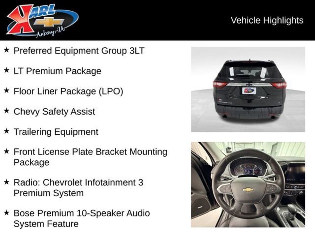 Certification Program Details: Karl Chevrolet of Ankeny, The Nation's #1 CarBravo Certified Dealer! Every CarBravo Certified vehicle includes: Comprehensive 126-Point Inspection Professionally inspected by factory-trained technicians to meet strict mechanical, safety, and cosmetic standards. 12-Month / 12,000-Mile Bumper-to-Bumper Limited Warranty Enjoy added peace of mind with extensive coverage from the day you drive off the lot. 24/7 Roadside Assistance & Courtesy Transportation Flat tire? Dead battery? Need a tow? You're covered anywhere, anytime throughout the warranty period. Vehicle History & Title Guarantee Clean title, completed safety recalls, and a full CARFAX® or AutoCheck® report provided for complete transparency. 10-Day / 500-Mile Exchange Promise If you don't absolutely love it, bring it back and exchange it no hassle, no stress. Experience peace of mind and premium protection exclusively from Karl Chevrolet of Ankeny, the Nation's #1 CarBravo Dealer!This 2021 Chevrolet Traverse LT Leather AWD 4DR LT LEATHER is a remarkable SUV that offers unparalleled versatility and capability. With its powerful 3.6L V6 engine and advanced all-wheel-drive system, this Traverse is ready to take on any adventure, whether it's conquering snowy roads or towing your boat to the lake. The LT Leather trim level adds a touch of sophistication with its premium leather-appointed seating, heated front seats, and Bose premium audio system.- LT Premium Package- Trailering Equipment- Chevy Safety Assist- Floor Liner Package (LPO)- Front License Plate Bracket Mounting PackageThe Traverse's spacious interior can comfortably accommodate up to seven passengers, with ample cargo space for all your gear. The advanced Chevrolet Infotainment 3 Premium system with connected navigation and 8-inch touchscreen keeps you connected and entertained on the go. Safety is also a top priority, with features like Automatic Emergency Braking, Front Pedestrian Braking, and Lane Keep Assist with Lane Departure Warning.This Traverse has been meticulously inspected and certified through the Karl Chevrolet CarBravo program, ensuring you can drive with confidence knowing it meets the highest standards of quality and safety. With a comprehensive 126-point inspection, a 12-month/12,000-mile bumper-to-bumper limited warranty, and 24/7 roadside assistance, you can enjoy added peace of mind from the moment you take the keys.Experience the perfect blend of capability, comfort, and technology in this exceptional 2021 Chevrolet Traverse LT Leather AWD 4DR LT LEATHER. Visit Karl Chevrolet of Ankeny, the Nation's #1 CarBravo Dealer, and let our team of experts help you discover why this SUV is the perfect fit for your lifestyle.At Karl Chevrolet we want to help you find the best new or used car in Ankeny that suits your needs. When you buy a new car at Karl Chevrolet you know you're finding a vehicle you can rely on. We have a great selection of Platinum Quality Pre-Owned Vehicles. We also pride ourselves in creating a friendly atmosphere and a reliable Dealership that you can trust. Call us and our experts will be glad to help you! (515) 299-4300. *Equipment and options are generated by a 3rd party vendor, exact vehicle options may vary. Please see a salesperson for complete details and vehicle information.