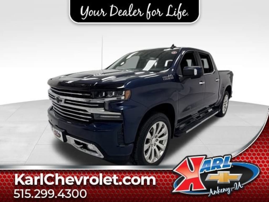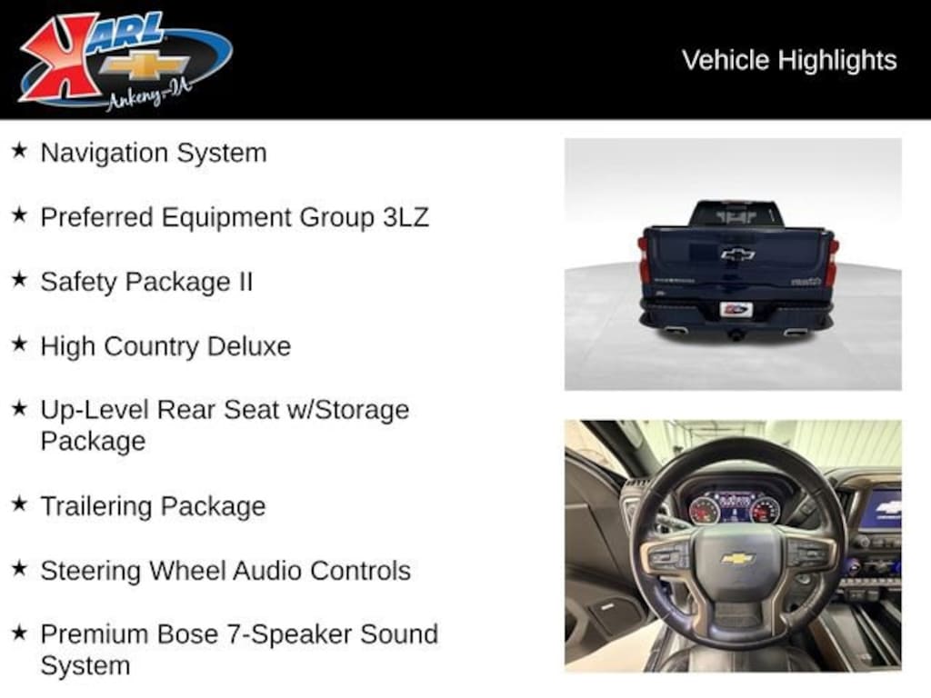 Recent Arrival! CARFAX One-Owner, Local Trade, Sold New at Karls & All Services Done at Karls! Equipped With Running Boards & Tonneau Cover! Certified. Northsky Blue Metallic 2022 Chevrolet Silverado 1500 LTD High Country 4WD CREW CAB 147 HIGH COUNTRY EcoTec3 6.2L V8 2nd Row Heated Outboard Seats, 8 Driver Information Center, Adaptive Cruise Control, Advanced Trailering System, All-Weather Floor Liner (LPO), Apple CarPlay/Android Auto, Auto-Dimming Inside Rear-View Mirror, Auto-Locking Rear Differential, Automatic Emergency Braking, Auxiliary External Transmission Oil Cooler, Bluetooth® For Phone, Body-Color Painted Mirror Caps, Chevrolet Connected Access Capable, Chevytec Spray-On Black Bedliner, Chrome Assist Steps, Chrome Grille, Chrome Recovery Hooks, Color-Keyed Carpeting Floor Covering, Compass, Deep-Tinted Glass, Driver Memory, Dual Exhaust w/Polished Outlets, Electric Rear-Window Defogger, Electronic Cruise Control, EZ Lift Power Lock & Release Tailgate, Floor Mounted Center Console, Following Distance Indicator, Forward Collision Alert, Front Black Bowtie Emblem (LPO), Front Carpeted Floor Mats, Front dual zone A/C, Front LED Fog Lamps, Front Pedestrian Braking, Fully automatic headlights, HD Rear Vision Camera, Heated Driver & Front Outboard Passenger Seats, Heated Steering Wheel, High Country Deluxe, Hitch Guidance w/Hitch View, Integrated Trailer Brake Controller, IntelliBeam Automatic High Beam On/Off, Keyless Open & Start, Lane Change Alert w/Side Blind Zone Alert, Lane Keep Assist w/Lane Departure Warning, Leather Wrapped Steering Wheel, LED Cargo Area Lighting, Manual Tilt/Telescoping Steering Column, Multi-Flex Tailgate, Navigation System, OnStar & Chevrolet Connected Services Capable, Outside Heated Power-Adjustable Mirrors, Power Door Locks, Power driver seat, Power Sliding Rear Window w/Rear Defogger, Power Sunroof, Power Tailgate, Power windows, Preferred Equipment Group 3LZ, Premium Bose 7-Speaker Sound System, Rear Carpeted Floor Mats, Rear Cross Traffic Alert, Rear Dual USB Charging-Only Ports, Rear Wheelhouse Liners, Remote Vehicle Starter System, Safety Alert Seat, Safety Package II, Standard Tailgate, Steering Wheel Audio Controls, Theft Deterrent System (Unauthorized Entry), Trailering Package, Universal Home Remote, Up-Level Rear Seat w/Storage Package, Ventilated Driver & Front Passenger Seats, Wheels: 22 x 9 Polished Aluminum, Wi-Fi Hot Spot Capable, Wireless Charging, Wireless Phone Projection. 14/19 City/Highway MPG 10-Speed Automatic 4WD