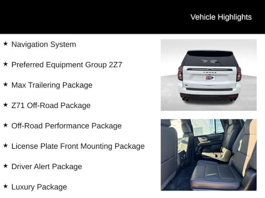 1st & 2nd Row Color-Keyed Carpeted Floor Mats, 2-Speed Active Electronic AutoTrac Transfer Case, 2nd Row Pwr Release 60/40 Split-Folding Bench Seat, 3rd Row 60/40 Power-Folding Split-Bench Seat, Advanced Trailering Package, Air Ride Adaptive Suspension, Auto-Dimming Inside Rear-View Mirror, Black Tubular Assist Steps, Bose 9-Speaker Stereo Audio System Feature, Bright Front & Rear Door Sill Plates, Color-Keyed Carpeting Floor Covering, Driver & Front Outboard Passenger Airbags, Driver Alert Package, Dual Exhaust System, Electronic Limited-Slip Differential, Enhanced Driver Information Center, Extra Capacity Cooling System, Floor Console w/Storage Area, Front High-Approach Angle Fascia, Hands-Free Rear Power Programmable Liftgate, HD Surround Vision, Heated 2nd Row Outboard Seats, Heated Steering Wheel, Hill Descent Control, Hitch Guidance w/Hitch View, Infotainment Display, Integrated Trailer Brake Controller, Lane Change Alert w/Side Blind Zone Alert, LED Daytime Running Lamps, License Plate Front Mounting Package, Luxury Package, Magnetic Ride Control Suspension, Max Trailering Package, Memory Settings, Memory Settings for Driver, Navigation System, Off-Road Capability Package, Off-Road Performance Package, Outside Heated Power-Adjustable Mirrors, Power Tilt & Telescopic Steering Column, Preferred Equipment Group 2Z7, Rear Cross Traffic Alert, Rear Pedestrian Alert, Red Horizontal-Mounted Recovery Hooks, Remote Start, SiriusXM Radio w/360L, Smart Trailer Integration Indicator, Universal Home Remote, Wireless Charging, Wrapped Steering Wheel, Z71 Off-Road Package.