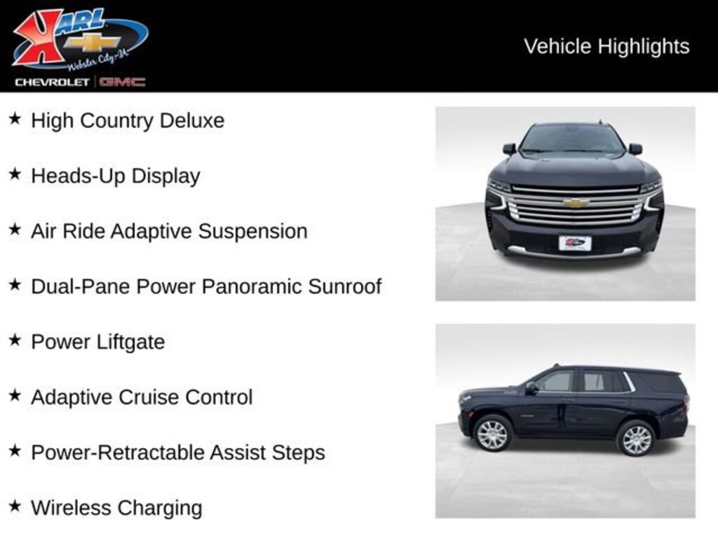 Whether you're looking for a family-friendly SUV, a capable towing vehicle, or a luxurious daily driver, this 2023 Chevrolet Tahoe High Country is the perfect choice. Come experience the difference for yourself and let our experts at Karl Chevrolet/GMC in Webster City help you make this exceptional SUV your own.