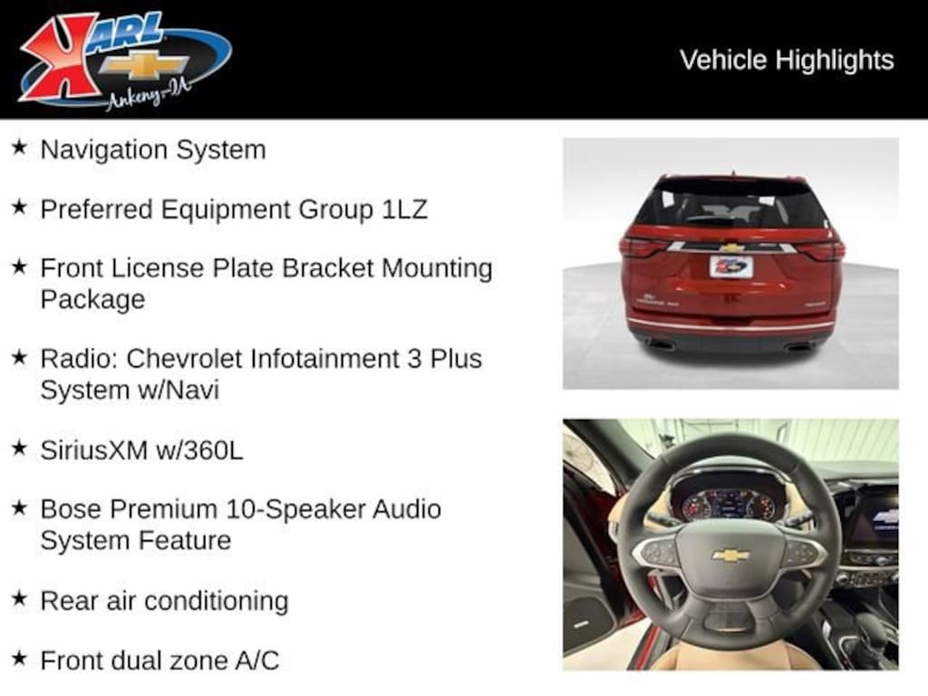 At Karl Chevrolet we want to help you find the best new or used car in Ankeny that suits your needs. Check out the 2023 Chevrolet Traverse For Sale in Ankeny, IA. When you buy a new car at Karl Chevrolet you know you're finding a vehicle you can rely on. We have a great selection of Platinum Quality Pre-Owned Vehicles. We also pride ourselves in creating a friendly atmosphere and reliable new car dealership that you can trust. Call us with any questions about our 2023 Chevrolet Traverse and our experts will be glad to help you! (515) 299-4300. *Equipment and options are generated by a 3rd party vendor, exact vehicle options may vary. Please see a salesperson for complete details and vehicle information.