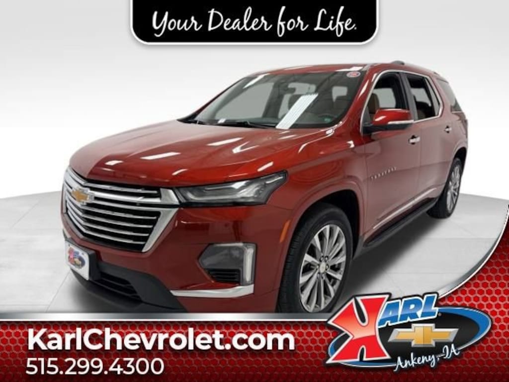 Recent Arrival! CARFAX One-Owner, Local Trade, Sold New at Karls & All Services Done at Karls! Clean CARFAX. Certified. Radiant Red Tintcoat 2023 Chevrolet Traverse Premier AWD 4DR PREMIER 3.6L V6 SIDI VVT AWD, 3rd row seats: split-bench, Apple CarPlay/Android Auto, Auto High-beam Headlights, Bose Premium 10-Speaker Audio System Feature, Dual SkyScape 2-Panel Power Sunroof, Exterior Parking Camera Rear, Front dual zone A/C, Front License Plate Bracket Mounting Package, Heated 2nd Row Outboard Position Seats, Heated Driver & Front Passenger Seats, Heated steering wheel, Memory seat, Navigation System, Power driver seat, Power windows, Preferred Equipment Group 1LZ, Radio: Chevrolet Infotainment 3 Plus System w/Navi, Rear air conditioning, SiriusXM w/360L, Steering wheel mounted audio controls, Ventilated Driver & Front Passenger Seats, Wheels: 20 Metallic Machined-Face Aluminum. 17/25 City/Highway MPG 9-Speed Automatic AWD