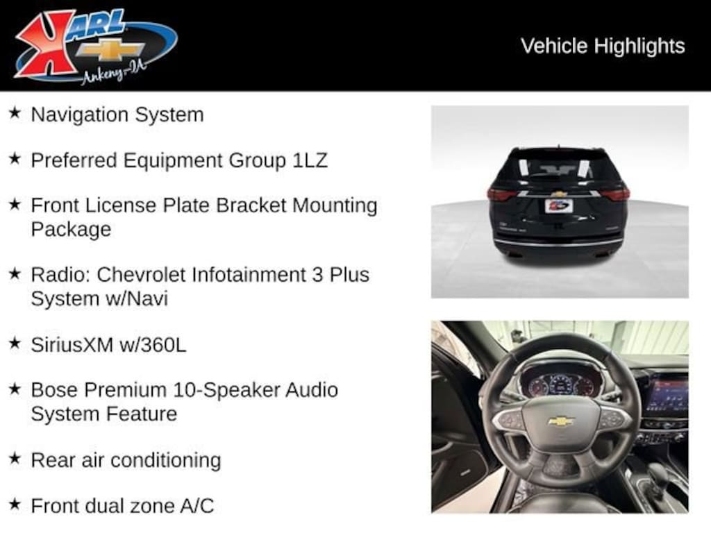 Certification Program Details: Karl Chevrolet of Ankeny, The Nation's #1 CarBravo Certified Dealer! Every CarBravo Certified vehicle includes: Comprehensive 126-Point Inspection Professionally inspected by factory-trained technicians to meet strict mechanical, safety, and cosmetic standards. 12-Month / 12,000-Mile Bumper-to-Bumper Limited Warranty Enjoy added peace of mind with extensive coverage from the day you drive off the lot. 24/7 Roadside Assistance & Courtesy Transportation Flat tire? Dead battery? Need a tow? You're covered anywhere, anytime throughout the warranty period. Vehicle History & Title Guarantee Clean title, completed safety recalls, and a full CARFAX® or AutoCheck® report provided for complete transparency. 10-Day / 500-Mile Exchange Promise If you don't absolutely love it, bring it back and exchange it no hassle, no stress. Experience peace of mind and premium protection exclusively from Karl Chevrolet of Ankeny, the Nation's #1 CarBravo Dealer!- Sunroof, Dual SkyScape 2-Panel Power- Navigation System- Bose Premium 10-Speaker Audio System- Heated Steering Wheel- Heated 2nd Row Outboard Position Seats- Heated Driver & Front Passenger Seats- 20 Metallic Machined-Face Aluminum WheelsThis 2023 Chevrolet Traverse Premier 4DR AWD is a versatile and well-equipped SUV that's ready to take on your adventures. With its powerful 3.6L V6 engine and advanced all-wheel-drive system, you'll enjoy a smooth and confident driving experience, whether navigating city streets or tackling winding roads. The sleek black exterior complements the spacious and well-appointed interior, featuring premium leather-appointed seating, dual-zone climate control, and a host of advanced technology and convenience features.Certified by Karl Chevrolet's exclusive CarBravo program, this Traverse has undergone a rigorous 126-point inspection and comes with a comprehensive 12-month/12,000-mile bumper-to-bumper warranty, giving you the peace of mind you deserve. You'll also enjoy 24/7 roadside assistance and the flexibility of our 10-day/500-mile exchange promise, allowing you to drive with confidence knowing that your satisfaction is our top priority.At Karl Chevrolet, we understand that finding the right vehicle is a crucial decision. That's why our team of experts is dedicated to providing you with the personalized attention and guidance you need to make an informed choice. We invite you to experience the difference at Karl Chevrolet, where we're committed to delivering exceptional customer service and premium-quality vehicles like this 2023 Chevrolet Traverse Premier 4DR AWD.At Karl Chevrolet we want to help you find the best new or used car in Ankeny that suits your needs. When you buy a new car at Karl Chevrolet you know you're finding a vehicle you can rely on. We have a great selection of Platinum Quality Pre-Owned Vehicles. We also pride ourselves in creating a friendly atmosphere and a reliable Dealership that you can trust. Call us and our experts will be glad to help you! (515) 299-4300. *Equipment and options are generated by a 3rd party vendor, exact vehicle options may vary. Please see a salesperson for complete details and vehicle information.