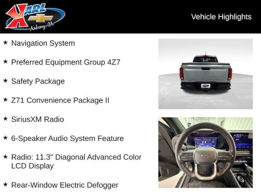 At Karl Chevrolet we want to help you find the best new or used car in Ankeny that suits your needs. When you buy a new car at Karl Chevrolet you know you're finding a vehicle you can rely on. We have a great selection of Platinum Quality Pre-Owned Vehicles. We also pride ourselves in creating a friendly atmosphere and a reliable Dealership that you can trust. Call us and our experts will be glad to help you! (515) 299-4300. *Equipment and options are generated by a 3rd party vendor, exact vehicle options may vary. Please see a salesperson for complete details and vehicle information.