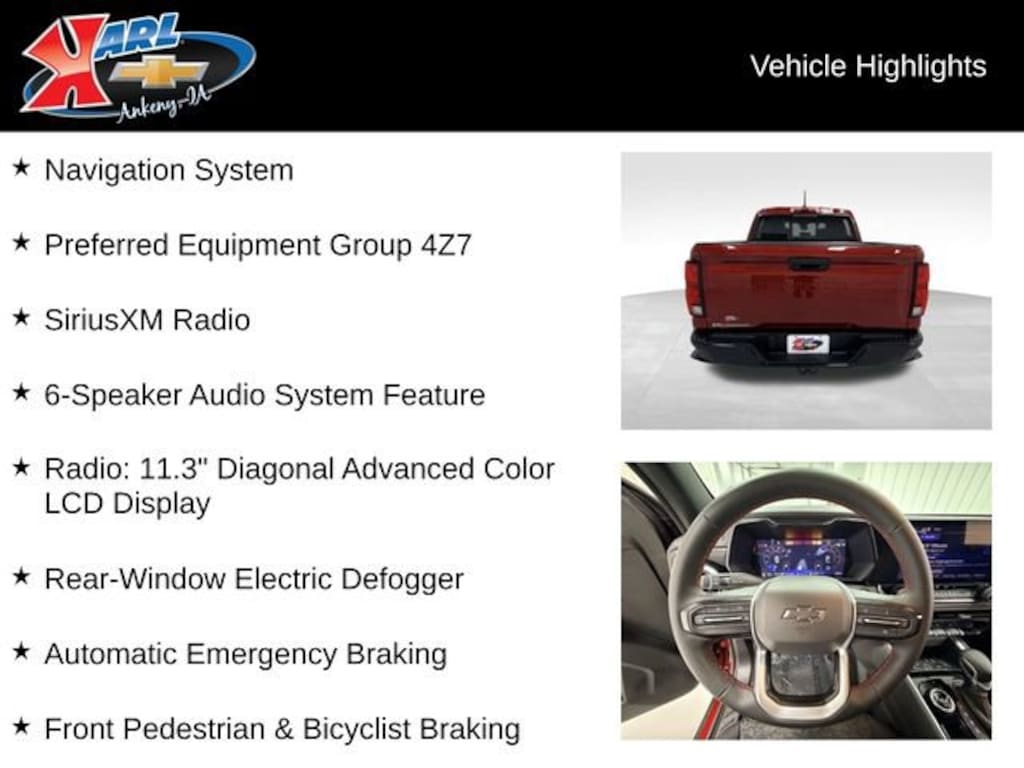 CARFAX One-Owner, Local Trade, Sold New at Karls & All Services Done at Karls! Equipped With Mud Flaps, Bed Liner & Running Boards! Clean CARFAX. Certified. Radiant Red Tintcoat 2024 Chevrolet Colorado Z71 4WD CREW CAB Z71 2.7L I4 Turbocharged DOHC 16V LEV3-ULEV50 310hp 4WD, 6-Speaker Audio System Feature, Apple CarPlay/Android Auto, Auto High-beam Headlights, Automatic Emergency Braking, Chevy Safety Assist, Electronic Automatic Cruise Control, Following Distance Indicator, Forward Collision Alert, Front Pedestrian & Bicyclist Braking, IntelliBeam Automatic High Beam On/Off, Lane Keep Assist w/Lane Departure Warning, Navigation System, Preferred Equipment Group 4Z7, Radio: 11.3 Diagonal Advanced Color LCD Display, Rear-Window Electric Defogger, SiriusXM Radio, Steering Wheel Mounted Audio Controls, Wheels: 18 x 8.5 Android Dark Full Gloss Aluminum, Wireless Phone Projection. 18/23 City/Highway MPG 8-Speed Automatic 4WD