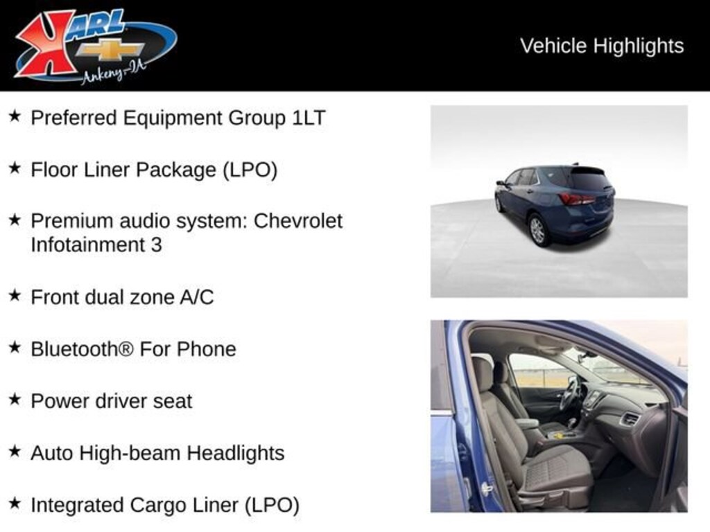 At Karl Chevrolet we want to help you find the best new or used car in Ankeny that suits your needs. When you buy a new car at Karl Chevrolet you know you're finding a vehicle you can rely on. We have a great selection of Platinum Quality Pre-Owned Vehicles. We also pride ourselves in creating a friendly atmosphere and a reliable Dealership that you can trust. Call us and our experts will be glad to help you! (515) 299-4300. *Equipment and options are generated by a 3rd party vendor, exact vehicle options may vary. Please see a salesperson for complete details and vehicle information.