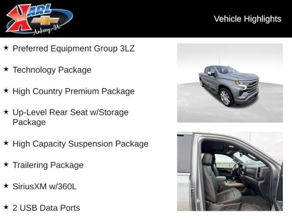 At Karl Chevrolet we want to help you find the best new or used car in Ankeny that suits your needs. When you buy a new car at Karl Chevrolet you know you're finding a vehicle you can rely on. We have a great selection of Platinum Quality Pre-Owned Vehicles. We also pride ourselves in creating a friendly atmosphere and a reliable Dealership that you can trust. Call us and our experts will be glad to help you! (515) 299-4300. *Equipment and options are generated by a 3rd party vendor, exact vehicle options may vary. Please see a salesperson for complete details and vehicle information.