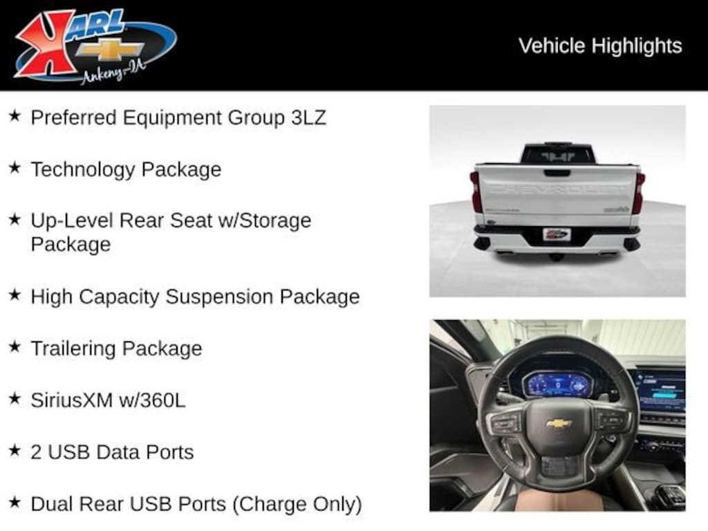Recent Arrival! CARFAX One-Owner. Local Trade. Sold New at Karls. Running Boards. Rev Hard-Rolling Tonneau Cover. Clean CARFAX. Certified. Iridescent Pearl Tricoat 2024 Chevrolet Silverado 1500 High Country 4WD CREW CAB 5.3L V8 EcoTec3 5.3L V8 10-Speed Automatic, 4WD, Jet Black/Umber Leather, 10-Way Power Driver Seat w/Lumbar, 10-Way Power Passenger Seat Adjuster w/Lumbar, 12.3 Multicolor Reconfigurable Digital Display, 120-Volt Bed Mounted Power Outlet, 120-Volt Interior Power Outlet, 15 Diagonal Multicolor Head-Up Display, 2 USB Data Ports, 2nd Row Heated Outboard Seats, Adaptive Cruise Control, Auto High-beam Headlights, Auto-Dimming Inside Rear-View Mirror, Auto-Locking Rear Differential, Bed View Camera, Bluetooth® For Phone, Body-Color Painted Mirror Caps, Chevrolet Connected Access Capable, Chevytec Spray-On Black Bedliner, Chrome Assist Steps, Chrome Recovery Hooks, Color-Keyed Carpeting Floor Covering, Deep-Tinted Glass, Driver Memory, Dual Exhaust w/Polished Outlets, Dual Rear USB Ports (Charge Only), Electric Rear-Window Defogger, Electrical Steering Column Lock, Floor Mounted Center Console, Forward Collision Alert, Front Carpeted Floor Mats, Front dual zone A/C, Front LED Fog Lamps, Front Rain-Sensing Wipers, HD Surround Vision, Heated Driver & Front Outboard Passenger Seats, Heated Steering Wheel, High Capacity Suspension Package, Hitch Guidance, Hitch Guidance w/Hitch View, In-Vehicle Trailering System App, Integrated Trailer Brake Controller, Keyless Open & Start, Lane Keep Assist w/Lane Departure Warning, LED Cargo Area Lighting, OnStar & Chevrolet Connected Services Capable, Outside Heated Power-Adjustable Mirrors, Perimeter Lighting, Power driver seat, Power Front Passenger Windows w/Express Up/Down, Power Front Windows w/Driver Express Up/Down, Power Rear Windows w/Express Down, Power Sliding Rear Window w/Rear Defogger, Power Tailgate, Power Tilt & Telescoping Steering Column, Preferred Equipment Group 3LZ, Premium Bose 7-Speaker Sound System, Rear Camera Mirror, Rear Carpeted Floor Mats, Rear Cross Traffic Braking, Rear Pedestrian Alert, Rear Wheelhouse Liners, Remote Vehicle Starter System, Safety Alert Seat, SiriusXM w/360L, Standard Tailgate, Steering Wheel Audio Controls, Technology Package, Theft Deterrent System (Unauthorized Entry), Trailer Camera Provisions, Trailer Side Blind Zone Alert, Trailering Package, Ultrasonic Front & Rear Park Assist, Universal Home Remote, Up-Level Rear Seat w/Storage Package, Ventilated Driver & Front Passenger Seats, Wheels: 20 x 9 Painted Aluminum, Wi-Fi Hot Spot Capable, Wrapped Steering Wheel. 15/20 City/Highway MPG 10-Speed Automatic 4WD