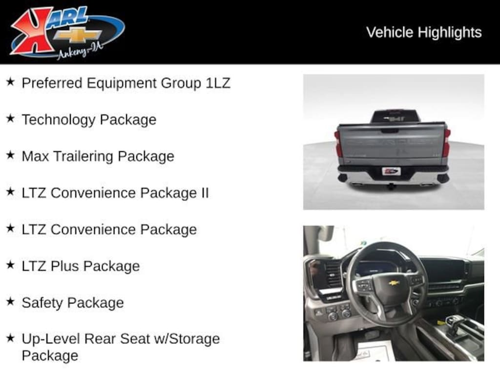 At Karl Chevrolet we want to help you find the best new or used car in Ankeny that suits your needs. When you buy a new car at Karl Chevrolet you know you're finding a vehicle you can rely on. We have a great selection of Platinum Quality Pre-Owned Vehicles. We also pride ourselves in creating a friendly atmosphere and a reliable Dealership that you can trust. Call us and our experts will be glad to help you! (515) 299-4300. *Equipment and options are generated by a 3rd party vendor, exact vehicle options may vary. Please see a salesperson for complete details and vehicle information.