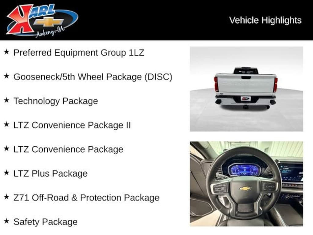 Certification Program Details: Karl Chevrolet of Ankeny, The Nation's #1 CarBravo Certified Dealer! Every CarBravo Certified vehicle includes: Comprehensive 126-Point Inspection Professionally inspected by factory-trained technicians to meet strict mechanical, safety, and cosmetic standards. 12-Month / 12,000-Mile Bumper-to-Bumper Limited Warranty Enjoy added peace of mind with extensive coverage from the day you drive off the lot. 24/7 Roadside Assistance & Courtesy Transportation Flat tire? Dead battery? Need a tow? You're covered anywhere, anytime throughout the warranty period. Vehicle History & Title Guarantee Clean title, completed safety recalls, and a full CARFAX® or AutoCheck® report provided for complete transparency. 10-Day / 500-Mile Exchange Promise If you don't absolutely love it, bring it back and exchange it no hassle, no stress. Experience peace of mind and premium protection exclusively from Karl Chevrolet of Ankeny, the Nation's #1 CarBravo Dealer!Duramax 6.6L V8 Turbodiesel, 10-Speed Automatic, 4WD - LTZ Plus Package, Z71 Off-Road & Protection Package, Technology Package, Gooseneck/5th Wheel Prep Package, Snow Plow Prep/Camper Package, 20 Polished Wheels, Rear Sliding Power Window, Adaptive Cruise Control, Rear Heated Seats, Rear Camera Mirror, Head-Up Display, Spray-On Bedliner, All-Terrain Tires.This 2024 Chevrolet Silverado 2500HD LTZ 4WD CREW 159 is a powerhouse of capability and technology. Equipped with the robust Duramax 6.6L V8 Turbodiesel engine and 10-speed automatic transmission, this truck delivers unparalleled towing and hauling performance. The LTZ Plus Package, Z71 Off-Road & Protection Package, and Gooseneck/5th Wheel Prep Package provide a wealth of premium features and off-road capabilities, making this Silverado the ultimate workhorse.Elevate your driving experience with the Technology Package, which includes a 15 Diagonal Head-Up Display and Rear Camera Mirror. Stay connected and entertained with the Chevrolet Infotainment 3 Premium system and 7-speaker Bose audio. Enjoy the convenience of Adaptive Cruise Control, Rear Heated Seats, and the Spray-On Bedliner for effortless hauling and towing.This Silverado 2500HD is a true standout in its class, combining rugged capability, advanced technology, and premium comfort. Whether you're tackling tough jobs or seeking a capable and well-equipped truck for your adventures, this Chevrolet Silverado 2500HD LTZ is the perfect choice.Certified as part of the Karl Chevrolet CarBravo program, this Silverado has undergone a comprehensive 126-point inspection, ensuring it meets the highest standards of quality and safety. With the added benefits of a 12-month/12,000-mile bumper-to-bumper warranty, 24/7 roadside assistance, and a 10-day/500-mile exchange promise, you can drive with confidence knowing you're behind the wheel of a vehicle you can trust.At Karl Chevrolet we want to help you find the best new or used car in Ankeny that suits your needs. When you buy a new car at Karl Chevrolet you know you're finding a vehicle you can rely on. We have a great selection of Platinum Quality Pre-Owned Vehicles. We also pride ourselves in creating a friendly atmosphere and a reliable Dealership that you can trust. Call us and our experts will be glad to help you! (515) 299-4300. *Equipment and options are generated by a 3rd party vendor, exact vehicle options may vary. Please see a salesperson for complete details and vehicle information.