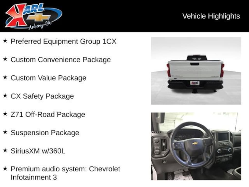 Certification Program Details: Karl Chevrolet of Ankeny, The Nation's #1 CarBravo Certified Dealer! Every CarBravo Certified vehicle includes: Comprehensive 126-Point Inspection Professionally inspected by factory-trained technicians to meet strict mechanical, safety, and cosmetic standards. 12-Month / 12,000-Mile Bumper-to-Bumper Limited Warranty Enjoy added peace of mind with extensive coverage from the day you drive off the lot. 24/7 Roadside Assistance & Courtesy Transportation Flat tire? Dead battery? Need a tow? You're covered anywhere, anytime throughout the warranty period. Vehicle History & Title Guarantee Clean title, completed safety recalls, and a full CARFAX® or AutoCheck® report provided for complete transparency. 10-Day / 500-Mile Exchange Promise If you don't absolutely love it, bring it back and exchange it no hassle, no stress. Experience peace of mind and premium protection exclusively from Karl Chevrolet of Ankeny, the Nation's #1 CarBravo Dealer! CUSTOM VALUE PACKAGE Chevytec Spray-On Bedliner Z71 Off-Road Package Lamps, Smoked Amber Roof Marker, (LED)This 2024 Chevrolet Silverado 2500HD Custom 4WD CREW CAB 159 CUSTOM is a powerful and capable truck that's ready to handle any job or adventure you throw its way. Equipped with a muscular 6.6L V8 engine and a 10-speed automatic transmission, this Silverado 2500HD delivers impressive performance and towing capacity. The 4-wheel drive system ensures confident handling in all conditions, while the Z71 Off-Road Package adds rugged features like off-road tuned shocks, hill descent control, and skid plates to tackle the toughest terrain.Beyond its impressive capabilities, this Silverado 2500HD also offers a wealth of premium features and conveniences. The Custom Convenience Package, CX Safety Package, and Preferred Equipment Group 1CX provide a host of advanced technologies and driver-assistive systems, including a premium audio system, SiriusXM with 360L, electric rear-window defogger, power windows, push-button start, remote keyless entry, and much more. The Chevytec Spray-On Bedliner and LED roof marker lamps add both functionality and style to this standout truck.Certified as part of the nation's #1 CarBravo program, this 2024 Chevrolet Silverado 2500HD Custom 4WD CREW CAB 159 CUSTOM has undergone a comprehensive 126-point inspection by factory-trained technicians to ensure it meets the highest standards of quality, safety, and reliability. With a 12-month/12,000-mile bumper-to-bumper limited warranty, 24/7 roadside assistance, and a 10-day/500-mile exchange promise, you can drive with confidence knowing you're backed by industry-leading coverage and protection.At Karl Chevrolet, we're committed to providing our customers with an exceptional vehicle-buying experience. Our expert team is ready to help you find the perfect Silverado 2500HD to meet your needs. Call us today at (515) 299-4300 to schedule a test drive and experience the power, capability, and premium features of this exceptional truck. *Equipment and options are generated by a 3rd party vendor, exact vehicle options may vary. Please see a salesperson for complete details and vehicle information.
