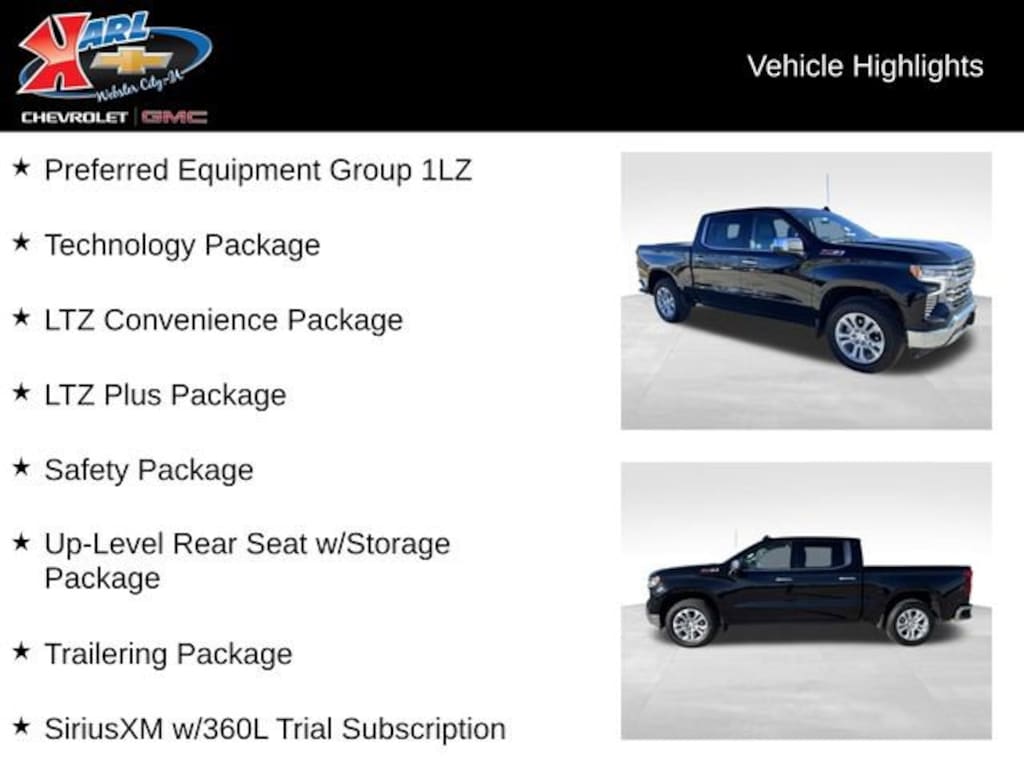 CARFAX One-Owner. Clean CARFAX. Certified. 2025 Chevrolet 4WD Black 10-Speed Automatic EcoTec3 6.2L V8 10-Speed Automatic, 4WD, Jet Black Leather, 10-Way Power Driver Seat w/Lumbar, 10-Way Power Passenger Seat Adjuster w/Lumbar, 12.3 Multicolor Reconfigurable Digital Display, 120-Volt Bed Mounted Power Outlet, 120-Volt Interior Power Outlet, 15 Diagonal Multicolor Head-Up Display, 2 USB Data Ports, Auto-Dimming Inside Rear-View Mirror, Auto-Locking Rear Differential, Bed View Camera, Bluetooth® For Phone, Chevytec Spray-On Black Bedliner, Chrome Mirror Caps, Color-Keyed Carpeting Floor Covering, Deep-Tinted Glass, Driver Memory, Dual Rear USB Ports (Charge Only), Electric Rear-Window Defogger, Electronic Cruise Control, Floor Mounted Center Console, Front Frame-Mounted Black Recovery Hooks, Front LED Fog Lamps, Front Rain-Sensing Wipers, Front Rubberized Vinyl Floor Mats, HD Surround Vision, Heated Driver & Front Outboard Passenger Seats, Heated Steering Wheel, Hitch Guidance, Hitch Guidance w/Hitch View, In-Vehicle Trailering System App, Integrated Trailer Brake Controller, Keyless Open & Start, LED Cargo Area Lighting, LTZ Convenience Package, LTZ Plus Package, OnStar Services Capable, Outside Heated Power-Adjustable Mirrors, Perimeter Lighting, Power Front Passenger Windows w/Express Up/Down, Power Front Windows w/Driver Express Up/Down, Power Rear Windows w/Express Down, Power Tailgate, Power Tilt & Telescoping Steering Column, Preferred Equipment Group 1LZ, Premium Bose 7-Speaker Sound System, Rear Camera Mirror, Rear Cross Traffic Braking, Rear Pedestrian Alert, Rear Rubberized-Vinyl Floor Mats, Rear Wheelhouse Liners, Remote Vehicle Starter System, Safety Alert Seat, Safety Package, SiriusXM w/360L Trial Subscription, Standard Tailgate, Steering Wheel Audio Controls, Technology Package, Teen Driver, Theft Deterrent System (Unauthorized Entry), Tire Pressure Monitoring System, Trailer Camera Provisions, Trailer Side Blind Zone Alert, Trailering Package, Ultrasonic Front & Rear Park Assist, Up-Level Rear Seat w/Storage Package, Ventilated Driver & Front Passenger Seats, Wi-Fi Hot Spot Capable, Wireless Charging, Wrapped Steering Wheel.