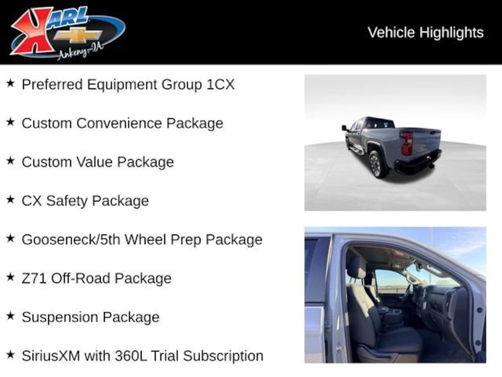 At Karl Chevrolet we want to help you find the best new or used car in Ankeny that suits your needs. When you buy a new car at Karl Chevrolet you know you're finding a vehicle you can rely on. We have a great selection of Platinum Quality Pre-Owned Vehicles. We also pride ourselves in creating a friendly atmosphere and a reliable Dealership that you can trust. Call us and our experts will be glad to help you! (515) 299-4300. *Equipment and options are generated by a 3rd party vendor, exact vehicle options may vary. Please see a salesperson for complete details and vehicle information.
