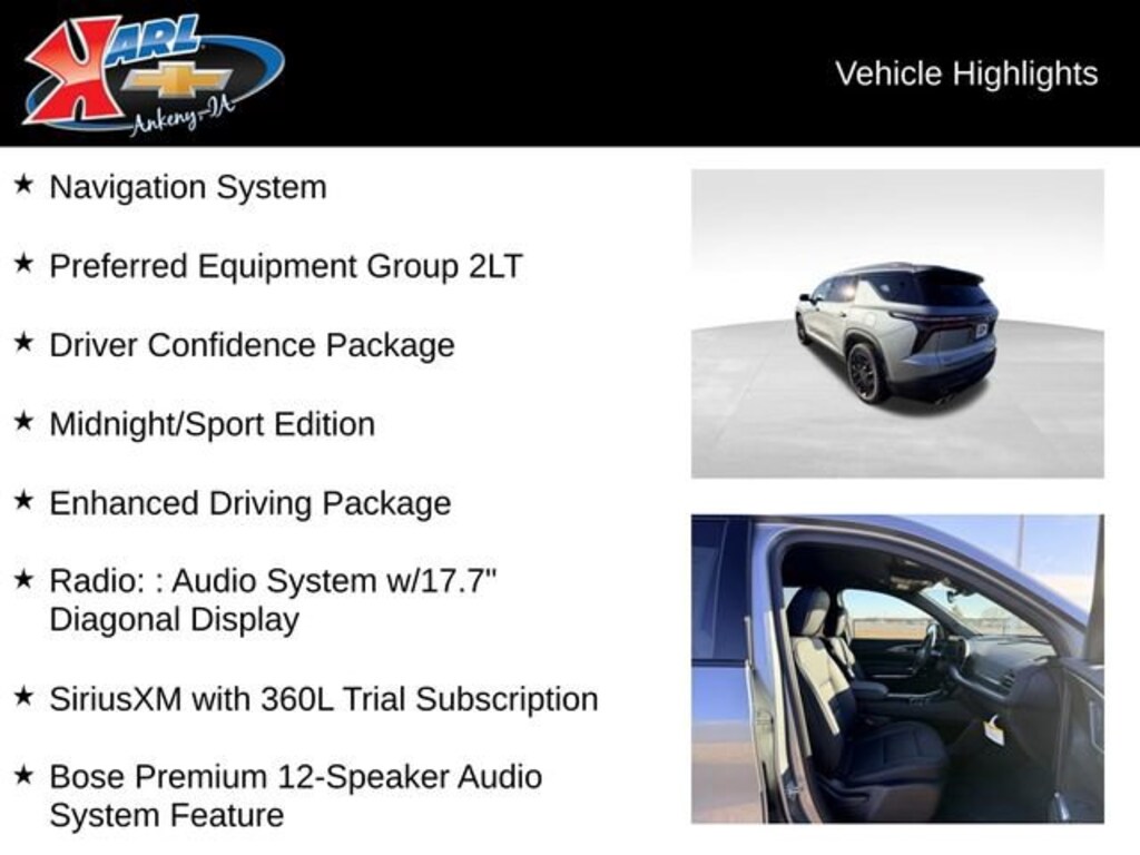 Certification Program Details: Karl Chevrolet of Ankeny, The Nation's #1 CarBravo Certified Dealer! Every CarBravo Certified vehicle includes: Comprehensive 126-Point Inspection Professionally inspected by factory-trained technicians to meet strict mechanical, safety, and cosmetic standards. 12-Month / 12,000-Mile Bumper-to-Bumper Limited Warranty Enjoy added peace of mind with extensive coverage from the day you drive off the lot. 24/7 Roadside Assistance & Courtesy Transportation Flat tire? Dead battery? Need a tow? You're covered anywhere, anytime throughout the warranty period. Vehicle History & Title Guarantee Clean title, completed safety recalls, and a full CARFAX® or AutoCheck® report provided for complete transparency. 10-Day / 500-Mile Exchange Promise If you don't absolutely love it, bring it back and exchange it no hassle, no stress. Experience peace of mind and premium protection exclusively from Karl Chevrolet of Ankeny, the Nation's #1 CarBravo Dealer! ENHANCED DRIVING PACKAGE MIDNIGHT/SPORT EDITION DRIVER CONFIDENCE PACKAGE Preferred Equipment Group 2LT Navigation System Bose Premium 12-Speaker Audio System Feature SiriusXM with 360L Trial Subscription Front dual zone A/C Power Liftgate Super Cruise Apple CarPlay/Android Auto Heated steering wheel Heated front seats Wheels: 20" High Gloss Black Painted AluminumThis 2025 Chevrolet Traverse LT 4DR LT is a remarkable SUV that offers a perfect blend of style, performance, and advanced technology. With its sleek and sophisticated exterior, this Traverse commands attention on the road. Under the hood, the powerful 2.5L DOHC engine delivers an impressive 8-speed automatic transmission and all-wheel drive capabilities, ensuring a smooth and responsive driving experience.The Traverse's interior is designed with your comfort and convenience in mind. Indulge in the premium Bose audio system, which delivers a truly immersive listening experience. Stay connected with seamless integration of your smartphone via Apple CarPlay and Android Auto. The front dual-zone climate control and heated steering wheel and seats provide a cozy and personalized environment, while the power liftgate makes loading and unloading a breeze.Safety is of the utmost importance, and this Traverse is equipped with a comprehensive suite of advanced driver assistance features. Enjoy the peace of mind of Super Cruise, the industry-leading hands-free driving technology, as well as Enhanced Automatic Parking Assist, Rear Pedestrian Alert, and Traffic Sign Recognition. These cutting-edge systems work together to help keep you and your loved ones protected on the road.This Chevrolet Traverse has been meticulously inspected and certified through the nation's #1 CarBravo program. You can trust that this vehicle has undergone a rigorous 126-point inspection, ensuring it meets the highest standards of quality and performance. With a 12-month/12,000-mile bumper-to-bumper warranty and 24/7 roadside assistance, you can drive with confidence, knowing that your investment is protected.At Karl Chevrolet we want to help you find the best new or used car in Ankeny that suits your needs. When you buy a new car at Karl Chevrolet you know you're finding a vehicle you can rely on. We have a great selection of Platinum Quality Pre-Owned Vehicles. We also pride ourselves in creating a friendly atmosphere and a reliable Dealership that you can trust. Call us and our experts will be glad to help you! (515) 299-4300. *Equipment and options are generated by a 3rd party vendor, exact vehicle options may vary. Please see a salesperson for complete details and vehicle information.