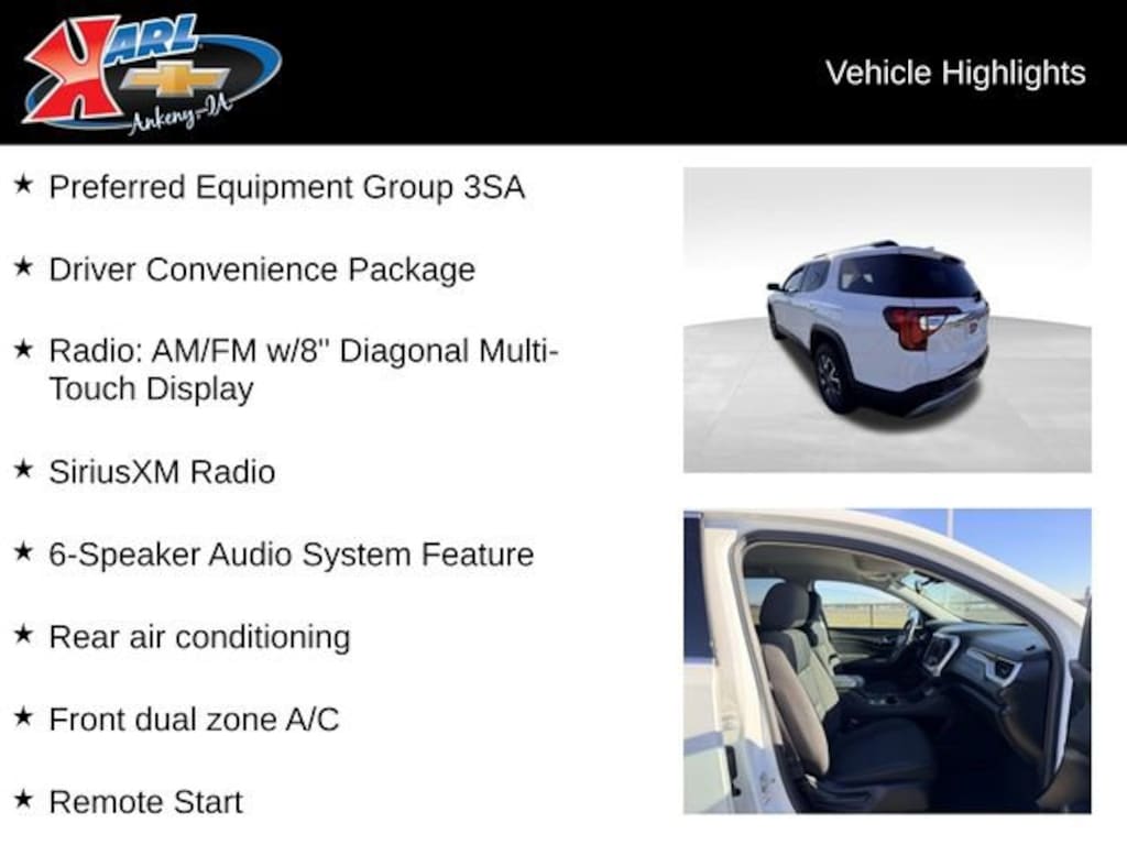 Packed with premium features, the Acadia SLE offers unparalleled comfort and convenience. The Driver Convenience Package includes an 8-way power driver's seat, heated front seats, and a hands-free power liftgate, making every drive more enjoyable. Stay connected with the 8-inch touchscreen infotainment system, which seamlessly integrates with your smartphone via Apple CarPlay and Android Auto.
