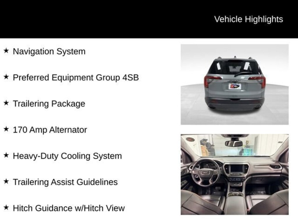 Certification Program Details: Karl Chevrolet Stuart, CarBravo Certified Dealer! Every CarBravo Certified vehicle includes: Comprehensive 126-Point Inspection Professionally inspected by factory-trained technicians to meet strict mechanical, safety, and cosmetic standards. 12-Month / 12,000-Mile Bumper-to-Bumper Limited Warranty Enjoy added peace of mind with extensive coverage from the day you drive off the lot. 24/7 Roadside Assistance & Courtesy Transportation Flat tire? Dead battery? Need a tow? You're covered anywhere, anytime throughout the warranty period. Vehicle History & Title Guarantee Clean title, completed safety recalls, and a full CARFAX® or AutoCheck® report provided for complete transparency. 10-Day / 500-Mile Exchange Promise If you don't absolutely love it, bring it back and exchange it no hassle, no stress. Experience peace of mind and premium protection exclusively from Karl Chevrolet Stuart!- Sunroof, Dual Skyscape 2-Panel Power- Trailering Package- Navigation System- Hitch Guidance with Hitch View- Trailering Assist GuidelinesThis 2021 GMC Acadia AT4 is a remarkable SUV that offers the perfect blend of capability, comfort, and style. Powered by a robust 3.6L V6 SIDI engine paired with a 9-Speed Automatic transmission and All-Wheel Drive, this Acadia delivers impressive performance and efficiency, with an EPA-estimated 19 MPG in the city and 26 MPG on the highway.The exterior of the Acadia AT4 commands attention with its Satin Steel Metallic Gray finish and rugged, off-road-inspired design. Step inside and you'll be greeted by a spacious and well-appointed cabin, featuring premium Jet Black leather-appointed seating, a Bose Premium audio system, and a host of advanced technology features, including a large 8-inch touchscreen display with navigation, Apple CarPlay, and Android Auto.But the true standout feature of this Acadia is its exceptional versatility. With the available Trailering Package, you can tow up to 4,000 pounds, making it the perfect companion for your outdoor adventures. The Dual Skyscape 2-Panel Power Sunroof adds an extra touch of luxury, allowing you and your passengers to enjoy the open skies.Whether you're navigating the city streets or tackling the great outdoors, this 2021 GMC Acadia AT4 is a true master of all trades. Experience the perfect blend of capability, comfort, and style visit Karl Chevrolet Stuart today and let us put you behind the wheel of this remarkable SUV.At Karl Chevrolet Stuart we want to help you find the best new or used car in Stuart that suits your needs. When you buy a new car at Karl Chevrolet Stuart you know you're finding a vehicle you can rely on. We have a great selection of CarBravo Quality Pre-Owned Vehicles. We also pride ourselves in creating a friendly atmosphere and a reliable Dealership that you can trust. Call us and our experts will be glad to help you! (515) 523-1201. *Equipment and options are generated by a 3rd party vendor, exact vehicle options may vary. Please see a salesperson for complete details and vehicle information.