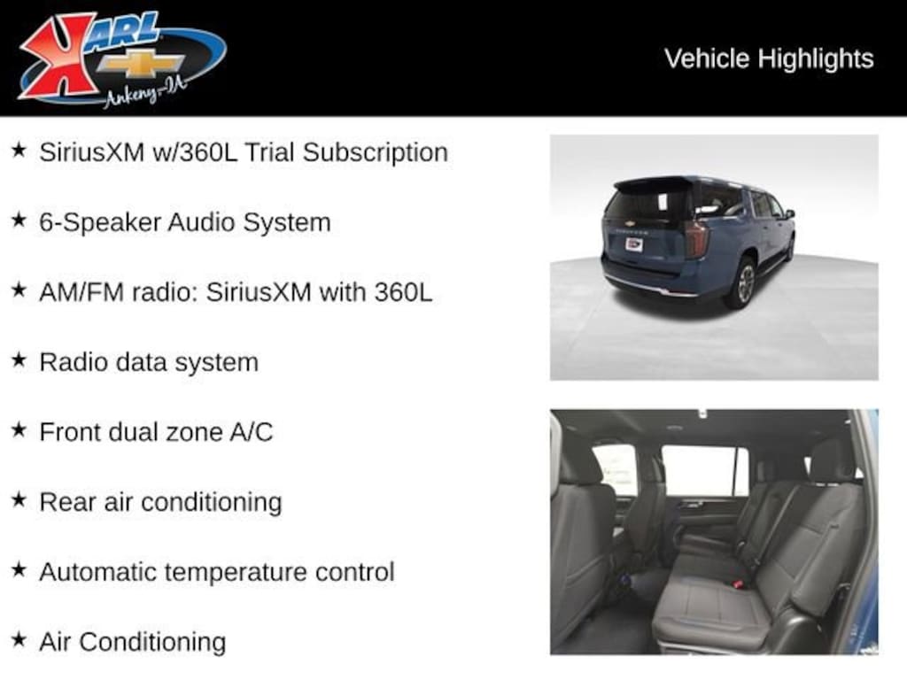 Factory MSRP: $68,945 $3,618 off MSRP! 2-Way Driver Power Lumbar Seat Adjuster, 2-Way Front Passenger Power Lumbar Seat Adjuster, 3rd row seats: split-bench, 6-Speaker Audio System, 6-Way Power Front Passenger Seat Adjuster, 8-Way Power Driver Seat Adjuster, Air Conditioning, AM/FM radio: SiriusXM with 360L, Automatic temperature control, Brake assist, Center Floor Console Delete, Compass, Delay-off headlights, Driver & Front Outboard Passenger Airbags, Driver vanity mirror, Dual front impact airbags, Dual front side impact airbags, Electronic Stability Control, Exterior Parking Camera Rear, Front 40/20/40 Split-Bench Seat, Front Bucket Seats, Front Center Armrest, Front dual zone A/C, Front reading lights, Heated door mirrors, Occupant sensing airbag, Overhead airbag, Overhead console, Passenger vanity mirror, Power driver seat, Power passenger seat, Power windows, Premium Cloth Seat Trim, Radio data system, Rain sensing wipers, Rear air conditioning, Rear anti-roll bar, Rear reading lights, Rear window wiper, SiriusXM w/360L Trial Subscription, Split folding rear seat, Telescoping steering wheel, Tilt steering wheel, Trip computer, Variably intermittent wipers, Voltmeter, Wheels: 18 x 8.5 Bright Silver Painted Aluminum, Wireless Apple CarPlay/Wireless Android Auto.Lakeshore Blue 2025 Chevrolet Suburban LS 4D Sport Utility EcoTec3 5.3L V8 10-Speed Automatic with Overdrive 4WD
