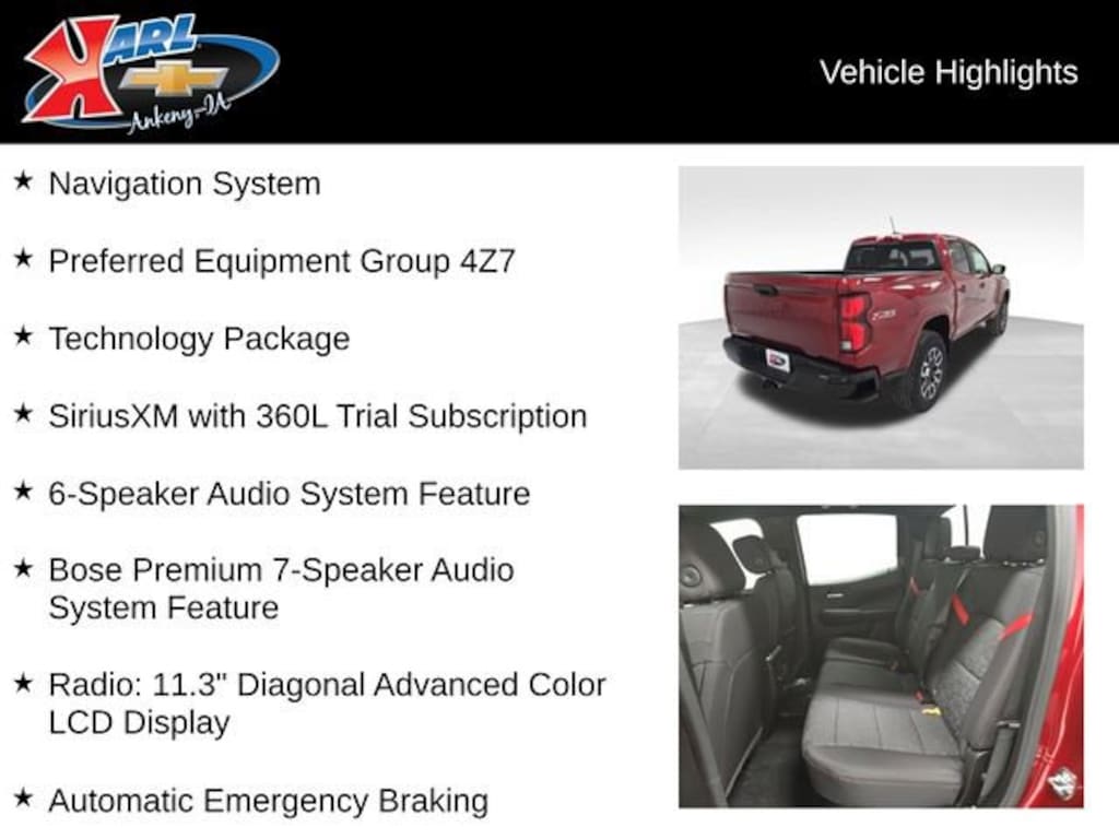 At Karl Chevrolet we want to help you find the best new or used car in Ankeny that suits your needs. When you buy a new car at Karl Chevrolet you know you're finding a vehicle you can rely on. We have a great selection of Platinum Quality Pre-Owned Vehicles. We also pride ourselves in creating a friendly atmosphere and a reliable Dealership that you can trust. Call us and our experts will be glad to help you! (515) 299-4300. *Equipment and options are generated by a 3rd party vendor, exact vehicle options may vary. Please see a salesperson for complete details and vehicle information. Price includes: $1000 - Chevrolet Consumer Cash Program. Exp. 03/02/2026