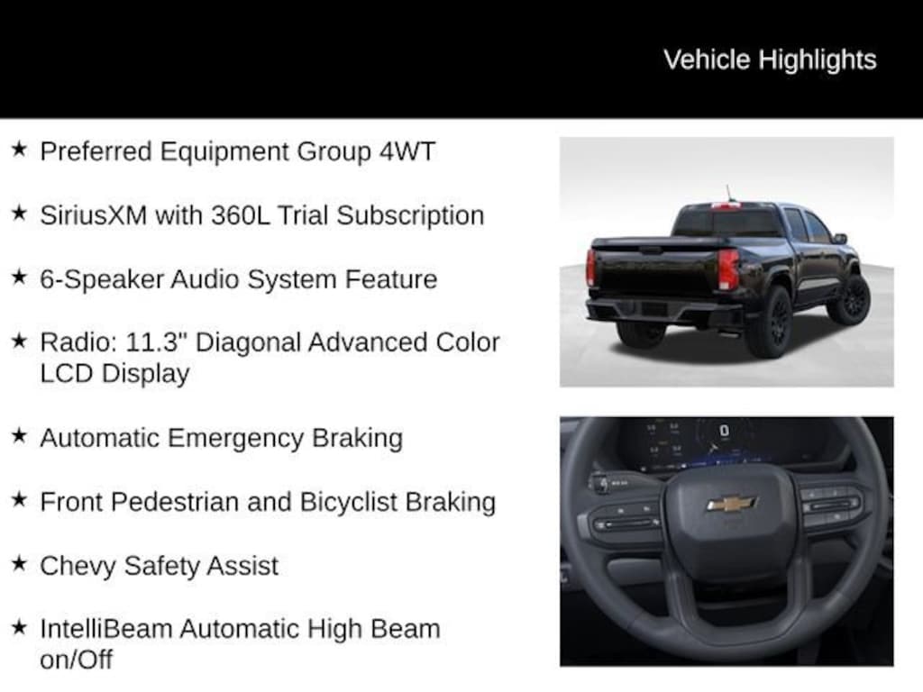 The 2026 Chevrolet Colorado Work Truck is a rugged and capable pickup that's ready to take on any task. With its powerful 2.7L turbocharged engine, advanced safety features, and impressive technology, this Colorado is the perfect companion for work or play.- Preferred Equipment Group 4WT- 6-Speaker Audio System Feature- Radio: 11.3 Diagonal Advanced Color LCD Display- SiriusXM with 360L Trial Subscription- IntelliBeam Automatic High Beam on/Off- Apple CarPlay/Android Auto- Following Distance Indicator- Forward Collision Alert- Lane Keep Assist with Lane Departure Warning- Steering Wheel Mounted Audio Controls- Wireless Phone Projection- Automatic Emergency Braking- Front Pedestrian and Bicyclist Braking- 4-Way Manual Passenger Seat Adjuster- 6-Way Manual Driver Seat Adjuster- Front Bucket Seats- Front Center Armrest- Split folding rear seat- Chevy Safety Assist- Wheels: 17 x 8 Ultra Silver Metallic SteelUnder the hood, the Colorado Work Truck packs a punch with its 2.7L turbocharged engine, delivering 310 horsepower and an impressive 22 MPG on the highway. Paired with an 8-speed automatic transmission and 4-wheel drive, this truck is ready to tackle any terrain with confidence.The exterior design of the Colorado Work Truck is sleek and modern, with a bold black paint job that commands attention. The rear step bumper and 17-inch steel wheels add to the rugged aesthetic, while the IntelliBeam automatic high beam headlights provide enhanced visibility for safer driving.Inside, the Colorado Work Truck is equipped with a wealth of advanced technology features, including a large 11.3-inch color LCD display, wireless phone projection, and a 6-speaker audio system. The split-folding rear seat and front center armrest provide ample storage and comfort for both work and leisure.Safety is a top priority in the Colorado Work Truck, with features like Forward Collision Alert, Lane Keep Assist, and Automatic Emergency Braking to help keep you and your passengers protected on the road.At Karl Chevrolet Stuart, we want to help you find the best new or used car in Stuart that suits your needs. When you buy a new car at Karl Chevrolet Stuart, you know you're finding a vehicle you can rely on. We have a great selection of CarBravo Quality Pre-Owned Vehicles. We also pride ourselves in creating a friendly atmosphere and a reliable Dealership that you can trust. Call us and our experts will be glad to help you! (515) 523-1201. *Equipment and options are generated by a 3rd party vendor, exact vehicle options may vary. Please see a salesperson for complete details and vehicle information. Price includes: $1000 - Chevrolet Consumer Cash Program. Exp. 04/30/2026