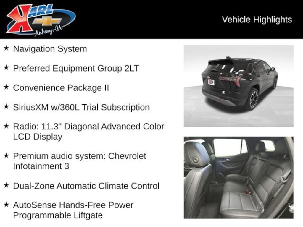Factory MSRP: $35,145 24/29 City/Highway MPG AWD, 2-Way Power Driver Lumbar Control Seat Adjuster, AutoSense Hands-Free Power Programmable Liftgate, Cabin Humidity & Windshield Sensor, Convenience Package II, Driver 6-Way Manual Seat Adjuster, Driver 8-Way Power Seat Adjuster, Dual-Zone Automatic Climate Control, Evotex Seat Trim, Front Bucket Seats, Front Center Armrest, Front Passenger 4-Way Manual Seat Adjuster, Heated Driver & Front Passenger Seats, Heated Wiper Park, Intermittent Front Rain-Sensing Wipers, Navigation System, Overhead Sunglass Storage, Preferred Equipment Group 2LT, Premium audio system: Chevrolet Infotainment 3, Programmable Universal Home Remote, Radio: 11.3 Diagonal Advanced Color LCD Display, SiriusXM w/360L Trial Subscription, Split folding rear seat, Wheels: 19 Black Machined-Face Aluminum, Wireless Phone Charging for Portable Devices.