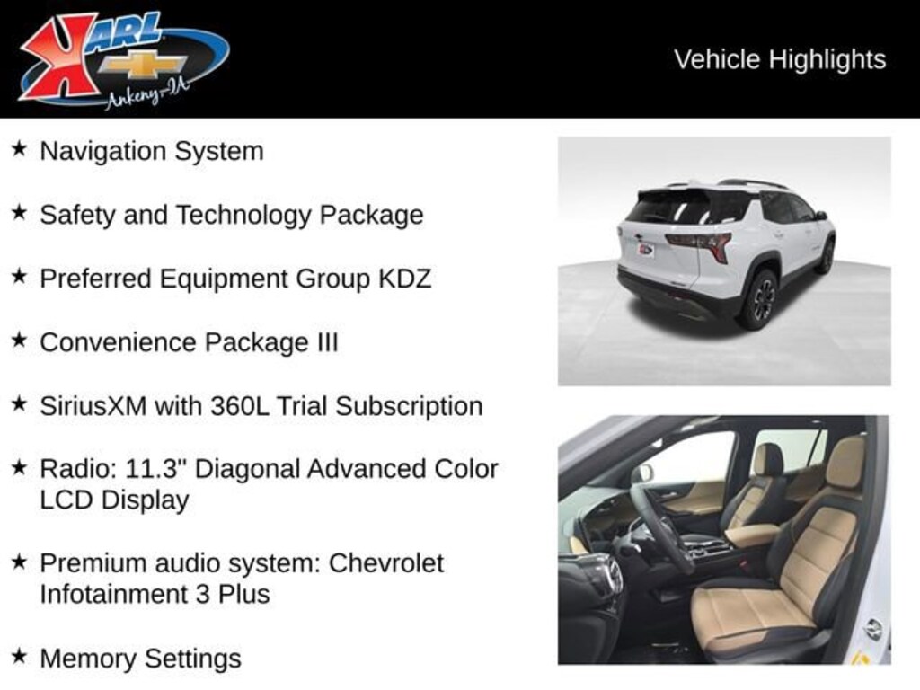 Factory MSRP: $41,980 25/29 City/Highway MPG AWD, 2-Way Power Driver Lumbar Control Seat Adjuster, Convenience Package III, Driver 8-Way Power Seat Adjuster, Front Bucket Seats, Front Center Armrest, Front Fog Lamps, Front Passenger 2-Way Power Lumbar Seat Adjuster, Front Passenger 4-Way Manual Seat Adjuster, Front Passenger 8-Way Power Seat Adjuster, HD Surround Vision, Heated Driver and Front Passenger Seats, Heated Rear Outboard Seating Positions, Memory Settings, Navigation System, Power Dual Glass Panoramic Sliding Sunroof, Power Liftgate, Preferred Equipment Group KDZ, Premium audio system: Chevrolet Infotainment 3 Plus, Radio: 11.3 Diagonal Advanced Color LCD Display, Rear Pedestrian Alert, Safety and Technology Package, SiriusXM with 360L Trial Subscription, Split folding rear seat, Sueded Microfiber Seat Trim, Traffic Sign Recognition, Ventilated Driver Seat, Ventilated Front Passenger Seat, Wheels: 17 Dark Android Painted Machined-Face.