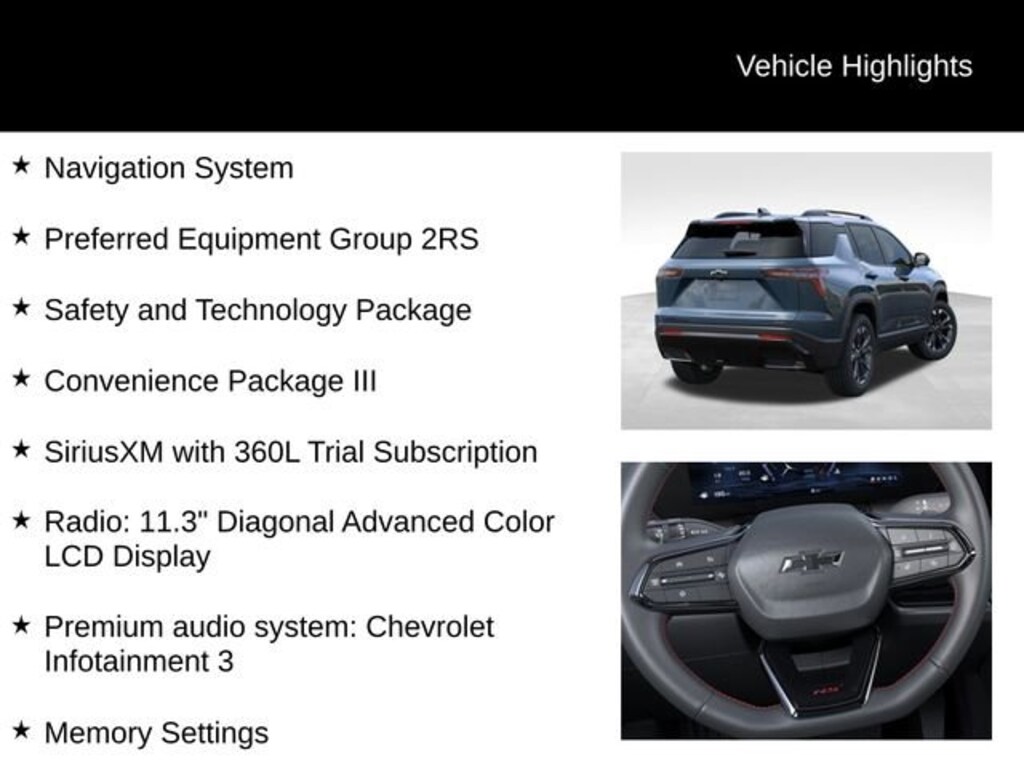 Discover the exceptional 2026 Chevrolet Equinox RS, a vehicle that seamlessly blends style, performance, and cutting-edge technology. This dynamic SUV is poised to elevate your driving experience and exceed your expectations.- Convenience Package III- Preferred Equipment Group 2RS- Safety and Technology PackageIndulge in the premium audio system, featuring the Chevrolet Infotainment 3 with an 11.3 diagonal advanced color LCD display and SiriusXM with 360L trial subscription. Enjoy the convenience of the power liftgate, front fog lamps, and the stunning panoramic sunroof. Stay connected with the built-in navigation system and traffic sign recognition.Elevate your comfort with the heated and ventilated front seats, as well as the heated rear outboard seating positions. The 2-way power driver lumbar control and 8-way power seat adjusters ensure a personalized fit. The split-folding rear seat offers versatility, while the memory settings allow you to customize your driving experience.Discover the exceptional performance of the 1.5L DOHC engine, paired with an 8-speed automatic transmission and all-wheel drive. With an EPA-estimated 25 city MPG and 29 highway MPG, this Equinox RS delivers impressive efficiency without compromising power.Enhance your driving confidence with the comprehensive suite of safety features, including HD Surround Vision, Rear Pedestrian Alert, and the advanced Chevrolet Safety Assist technologies. The 19 Carbon Flash Metallic aluminum wheels and bold exterior design elements add a touch of sporty sophistication to this remarkable SUV.At Karl Chevrolet Stuart, we want to help you find the best new or used car in Stuart that suits your needs. When you buy a new car at Karl Chevrolet Stuart, you know you're finding a vehicle you can rely on. We have a great selection of CarBravo Quality Pre-Owned Vehicles. We also pride ourselves in creating a friendly atmosphere and a reliable Dealership that you can trust. Call us and our experts will be glad to help you! (515) 523-1201. *Equipment and options are generated by a 3rd party vendor, exact vehicle options may vary. Please see a salesperson for complete details and vehicle information.