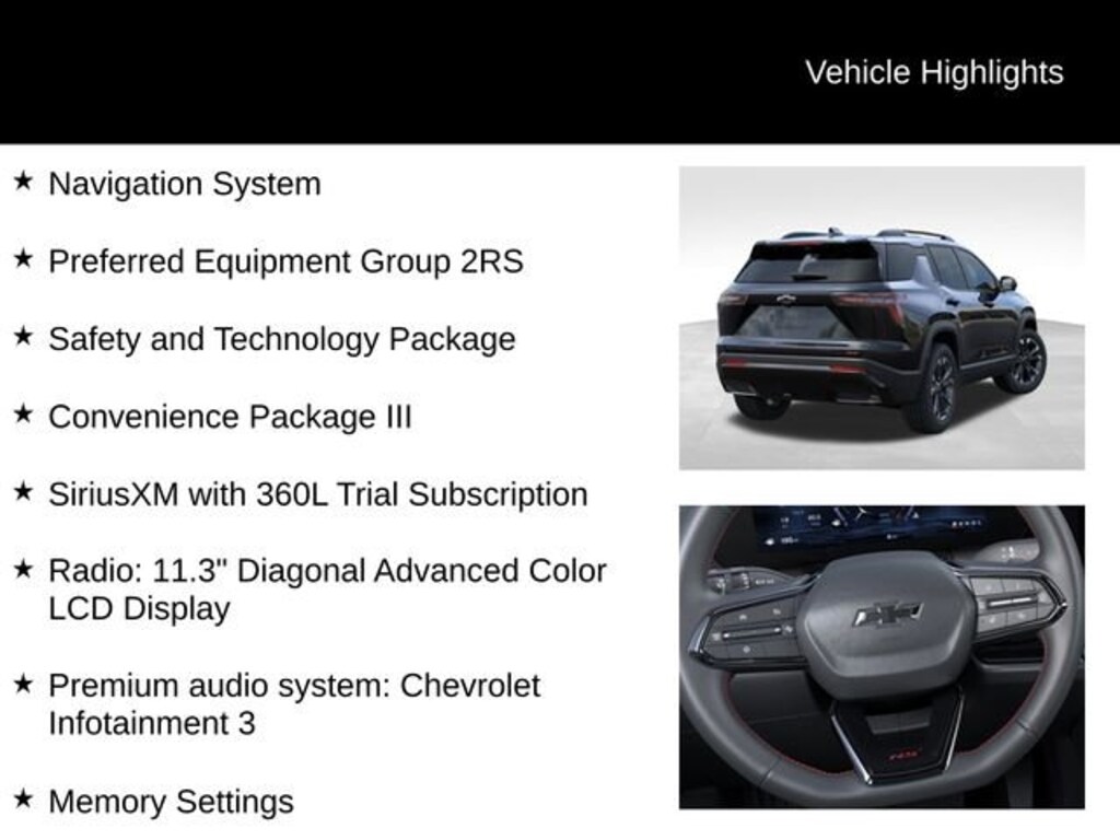 The 2026 Chevrolet Equinox RS is a remarkable SUV that combines style, performance, and cutting-edge technology. With its sleek black exterior and powerful 1.5L DOHC engine paired with an 8-speed automatic transmission and all-wheel drive, this Equinox RS is ready to take on any adventure.- Convenience Package III- Preferred Equipment Group 2RS- Safety and Technology Package- Premium audio system: Chevrolet Infotainment 3- Radio: 11.3 Diagonal Advanced Color LCD Display- SiriusXM with 360L Trial Subscription- Memory Settings- Power Liftgate- Front Fog Lamps- HD Surround Vision- Rear Pedestrian Alert- Traffic Sign Recognition- Navigation System- 2-Way Power Driver Lumbar Control Seat Adjuster- Driver 8-Way Power Seat AdjusterThe Equinox RS boasts an impressive array of features that will elevate your driving experience. From the premium audio system with SiriusXM to the advanced safety technologies like HD Surround Vision and Rear Pedestrian Alert, this SUV is designed to keep you connected, entertained, and secure. The power-adjustable seats with lumbar support and memory settings ensure exceptional comfort, while the panoramic sunroof and ventilated front seats add an extra touch of luxury.Under the hood, the turbocharged 1.5L engine delivers a responsive and efficient performance, with an estimated 25 mpg in the city and 29 mpg on the highway. The all-wheel-drive system provides confident handling and traction, making the Equinox RS a versatile choice for any driving condition.The Equinox RS also comes equipped with a comprehensive suite of advanced driver-assistance features, including automatic high-beam headlights, traffic sign recognition, and a rearview camera mirror washer. These technologies work together to enhance your safety and awareness on the road, giving you peace of mind behind the wheel.Whether you're commuting to work, embarking on a family road trip, or tackling your next adventure, the 2026 Chevrolet Equinox RS is the perfect companion. Its sleek design, impressive performance, and cutting-edge features make it a standout in the SUV segment.At Karl Chevrolet Stuart, we want to help you find the best new or used car in Stuart that suits your needs. When you buy a new car at Karl Chevrolet Stuart, you know you're finding a vehicle you can rely on. We have a great selection of CarBravo Quality Pre-Owned Vehicles. We also pride ourselves in creating a friendly atmosphere and a reliable Dealership that you can trust. Call us and our experts will be glad to help you! (515) 523-1201. *Equipment and options are generated by a 3rd party vendor, exact vehicle options may vary. Please see a salesperson for complete details and vehicle information.