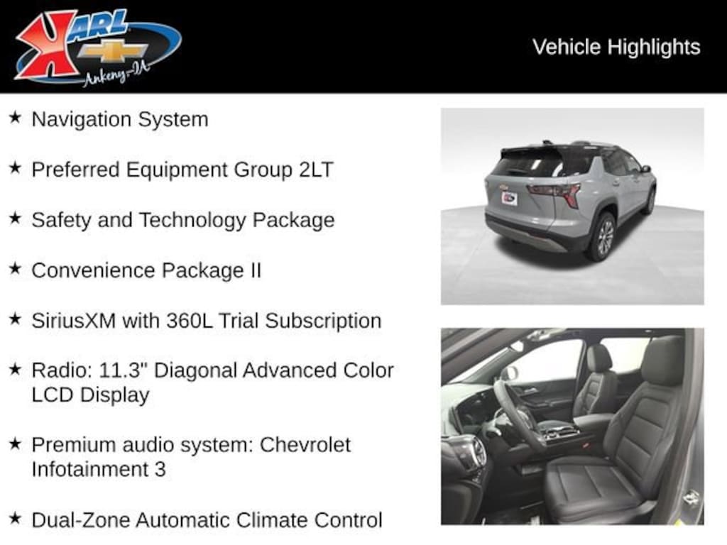 At Karl Chevrolet we want to help you find the best new or used car in Ankeny that suits your needs. When you buy a new car at Karl Chevrolet you know you're finding a vehicle you can rely on. We have a great selection of Platinum Quality Pre-Owned Vehicles. We also pride ourselves in creating a friendly atmosphere and a reliable Dealership that you can trust. Call us and our experts will be glad to help you! (515) 299-4300. *Equipment and options are generated by a 3rd party vendor, exact vehicle options may vary. Please see a salesperson for complete details and vehicle information.