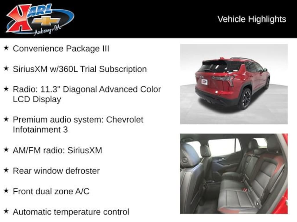 Factory MSRP: $38,840 24/29 City/Highway MPG AWD, 2-Way Power Driver Lumbar Control Seat Adjuster, Air Conditioning, AM/FM radio: SiriusXM, Auto High-beam Headlights, Automatic temperature control, Brake assist, Compass, Convenience Package III, Driver door bin, Driver vanity mirror, Dual front impact airbags, Dual front side impact airbags, Electronic Stability Control, Emergency communication system: OnStar and Chevrolet connected services capable, Evotex Seat Trim, Front anti-roll bar, Front Bucket Seats, Front Center Armrest, Front dual zone A/C, Front Passenger 2-Way Power Lumbar Seat Adjuster, Front Passenger 8-Way Power Seat Adjuster, Front reading lights, Garage door transmitter, Heated Driver & Front Passenger Seats, Heated Rear Outboard Seating Positions, Heated steering wheel, Memory Settings, Outside temperature display, Overhead airbag, Overhead console, Panic alarm, Power Liftgate, Power steering, Power windows, Premium audio system: Chevrolet Infotainment 3, Radio: 11.3 Diagonal Advanced Color LCD Display, Rain sensing wipers, Rear reading lights, Rear seat center armrest, Rear window defroster, Rear window wiper, Remote keyless entry, SiriusXM w/360L Trial Subscription, Sport steering wheel, Telescoping steering wheel, Ventilated Driver Seat, Ventilated Front Passenger Seat, Wheels: 19 Carbon Flash Metallic Aluminum.