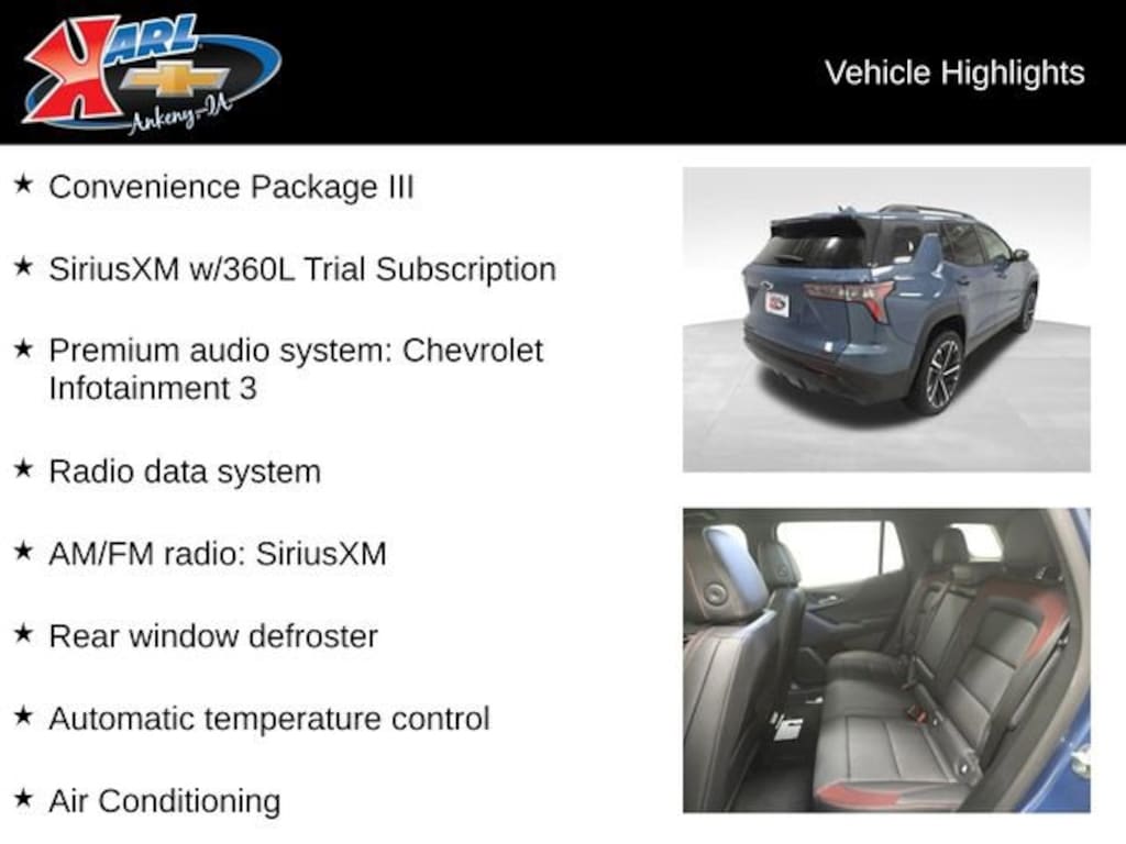 Factory MSRP: $38,845 24/29 City/Highway MPG AWD, Air Conditioning, AM/FM radio: SiriusXM, Automatic temperature control, Brake assist, Convenience Package III, Driver 8-Way Power Seat Adjuster, Driver door bin, Dual front impact airbags, Dual front side impact airbags, Electronic Stability Control, Evotex Seat Trim, Front anti-roll bar, Front Center Armrest, Front Passenger 2-Way Power Lumbar Seat Adjuster, Front Passenger 4-Way Manual Seat Adjuster, Front Passenger 8-Way Power Seat Adjuster, Front reading lights, Heated Driver & Front Passenger Seats, Heated Rear Outboard Seating Positions, Heated steering wheel, Low tire pressure warning, Memory Settings, Occupant sensing airbag, Outside temperature display, Overhead airbag, Overhead console, Passenger vanity mirror, Power Liftgate, Power steering, Power windows, Premium audio system: Chevrolet Infotainment 3, Radio data system, Rain sensing wipers, Rear reading lights, Rear window defroster, Rear window wiper, Remote keyless entry, SiriusXM w/360L Trial Subscription, Tachometer, Telescoping steering wheel, Tilt steering wheel, Ventilated Driver Seat, Ventilated Front Passenger Seat, Wheels: 19 Carbon Flash Metallic Aluminum.