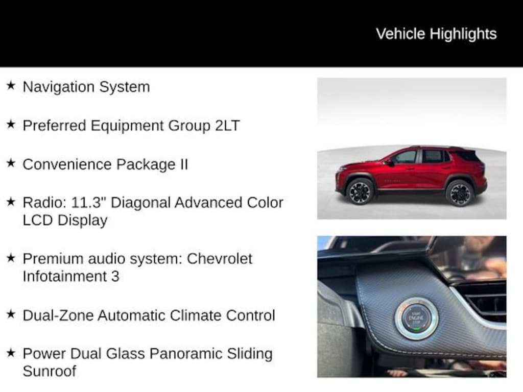 Factory MSRP: $38,446 $2,747 off MSRP! 2-Way Power Driver Lumbar Control Seat Adjuster, Convenience Package II, Driver 6-Way Manual Seat Adjuster, Driver 8-Way Power Seat Adjuster, Dual-Zone Automatic Climate Control, Evotex Seat Trim, Front Bucket Seats, Front Center Armrest, Front Passenger 4-Way Manual Seat Adjuster, Heated Wiper Park, Intermittent Front Rain-Sensing Wipers, Navigation System, Overhead Sunglass Storage, Power Dual Glass Panoramic Sliding Sunroof, Preferred Equipment Group 2LT, Premium audio system: Chevrolet Infotainment 3, Programmable Universal Home Remote, Radio: 11.3 Diagonal Advanced Color LCD Display, Roof Rails, Split folding rear seat, Wheels: 19 Black Machined-Face Aluminum.