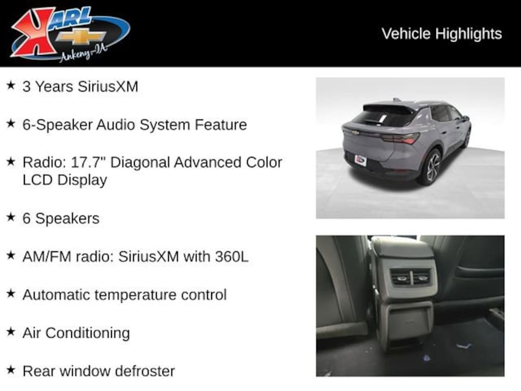 Factory MSRP: $46,894 $10,366 off MSRP! Priced below KBB Fair Purchase Price! 3 Years SiriusXM, 6 Speakers, 6-Speaker Audio System Feature, Air Conditioning, AM/FM radio: SiriusXM with 360L, Auto High-beam Headlights, Auto-dimming Rear-View mirror, Automatic temperature control, Brake assist, Compass, Driver door bin, Driver vanity mirror, Dual front impact airbags, Dual front side impact airbags, Electric Drive Unit, Electronic Stability Control, Emergency communication system: OnStar and Chevrolet connected services capable, Evotex Seat Trim, Front anti-roll bar, Front Bucket Seats, Front Center Armrest, Front Passenger 4-Way Manual Seat Adjuster, Heated door mirrors, Heated steering wheel, Knee airbag, Occupant sensing airbag, Outside temperature display, Overhead airbag, Overhead console, Power door mirrors, Power Driver Lumbar Control, Power driver seat, Power Liftgate, Power windows, Radio: 17.7 Diagonal Advanced Color LCD Display, Rear reading lights, Rear seat center armrest, Rear window defroster, Rear window wiper, Remote keyless entry, Speed control, Spoiler, Steering wheel mounted audio controls, Traction control, Turn signal indicator mirrors.