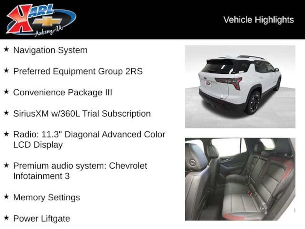 Factory MSRP: $39,340 24/29 City/Highway MPG AWD, 2-Way Power Driver Lumbar Control Seat Adjuster, Convenience Package III, Driver 8-Way Power Seat Adjuster, Evotex Seat Trim, Front Bucket Seats, Front Center Armrest, Front Passenger 2-Way Power Lumbar Seat Adjuster, Front Passenger 4-Way Manual Seat Adjuster, Front Passenger 8-Way Power Seat Adjuster, Heated Driver & Front Passenger Seats, Heated Rear Outboard Seating Positions, Memory Settings, Navigation System, Power Liftgate, Preferred Equipment Group 2RS, Premium audio system: Chevrolet Infotainment 3, Radio: 11.3 Diagonal Advanced Color LCD Display, SiriusXM w/360L Trial Subscription, Split folding rear seat, Ventilated Driver Seat, Ventilated Front Passenger Seat, Wheels: 19 Carbon Flash Metallic Aluminum.