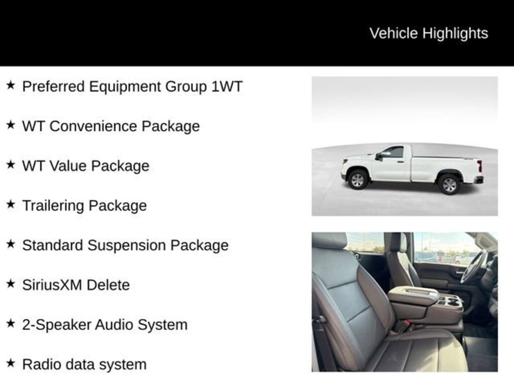 Factory MSRP: $47,550 $4,245 off MSRP! 2-Speaker Audio System, 3.5 Monochromatic Display Driver Info Center, 4-Way Manual Driver Seat Adjuster, 40/20/40 Front Split Bench Seat, ABS brakes, Air Conditioning, Apple CarPlay/Android Auto, Black (Semi-Gloss) Front Bumper, Black (Semi-Gloss) Rear Bumper, Bluetooth® For Phone, Brake assist, Compass, Deep-Tinted Glass, Dual front impact airbags, Dual front side impact airbags, Electric Rear-Window Defogger, Electronic Cruise Control, Electronic Stability Control, Emergency communication system: OnStar, External Engine Oil Cooler, Following Distance Indicator, Forward Collision Alert, Front Frame-Mounted Black Recovery Hooks, Front Pedestrian Braking, HD Rear Vision Camera, Heated door mirrors, Heated Power-Adjustable Outside Mirrors, Hitch Guidance, Inside Rear-View Mirror w/Tilt, Lane Keep Assist w/Lane Departure Warning, Locking Tailgate, Manual Tailgate Function w/No EZ Lift, Manual Tilt Wheel Steering Column, OnStar Services Capable, Outside temperature display, Overhead console, Power Front Windows w/Driver Express Up/Down, Power Front Windows w/Passenger Express Down, Power windows, Preferred Equipment Group 1WT, Premium audio system: Chevrolet Infotainment 3, Radio data system, Remote Keyless Entry, Rubberized-Vinyl Floor Covering, SiriusXM Delete, Solar Absorbing Tinted Glass, Standard Suspension Package, Standard Tailgate, Teen Driver, Tire Pressure Monitoring System, Trailering Package, Wheels: 17 x 8 Ultra Silver Painted Steel, Wi-Fi Hot Spot Capable, WT Convenience Package, WT Value Package.Summit White 2026 Chevrolet Silverado 1500 2D Standard Cab WT EcoTec3 5.3L V8 16/19 City/Highway MPG 10-Speed Automatic 4WDHere at Karl Chevrolet of Stuart we want to help you find the best vehicle to suit your needs. With our huge selection of new and pre-owned vehicles, we're sure to have the right car for you! We pride ourselves on creating a friendly buying experience and earning the title of Your Dealer for Life. Give us a call at 515.523.1201 and speak to our experts to find out just how easy it is to get the vehicle of your dreams! Price includes: $1000 - GM Bonus Cash. Exp. 11/03/2025 $2000 - Chevrolet Consumer Cash Program. Exp. 11/03/2025