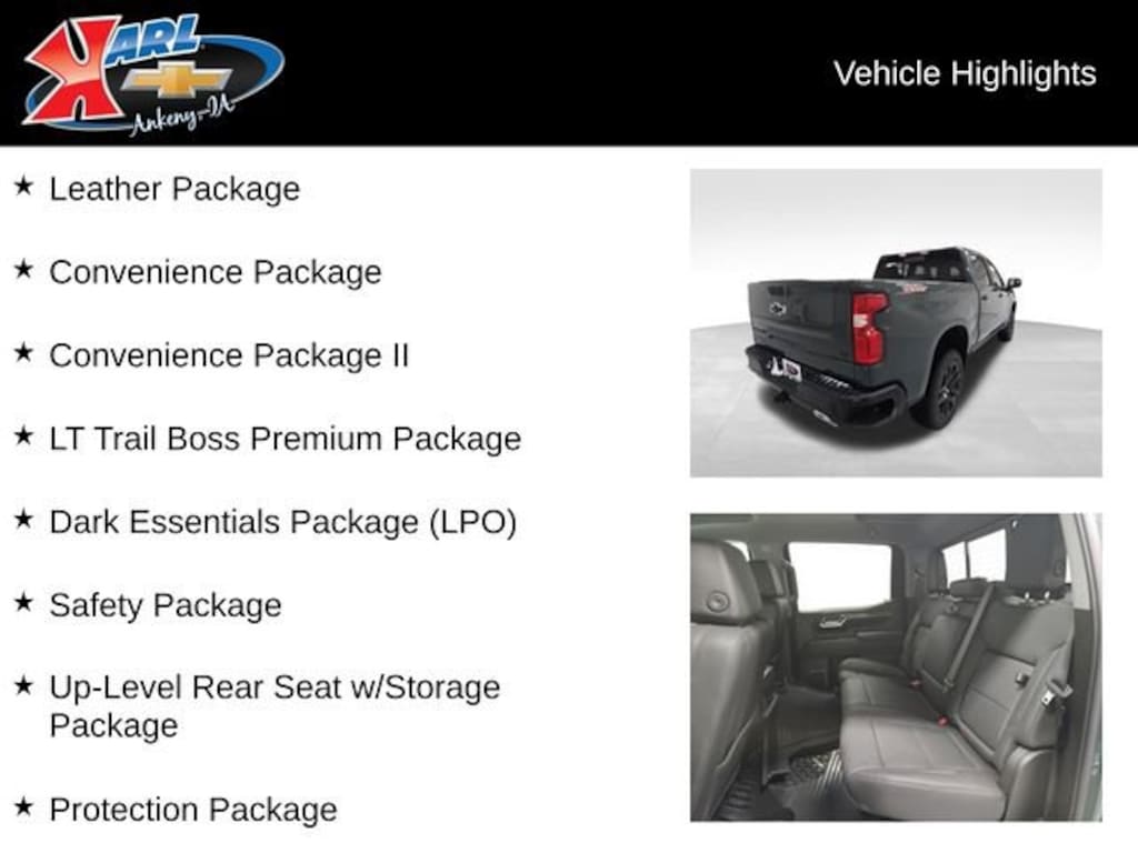 Factory MSRP: $71,369 $6,560 off MSRP! 10-Speed Automatic, 4WD, Jet Blk Lth-Appointed Fro Leather, 10-Way Power Driver Seat w/Lumbar, 12.3 Multicolor Reconfigurable Digital Display, 120-Volt Bed Mounted Power Outlet, 120-Volt Interior Power Outlet, 3 Years SiriusXM, 6 Speakers, 6-Speaker Audio System, Air Conditioning, All-Weather Floor Liner (LPO) (AAK), Auto High-beam Headlights, Automatic temperature control, Black Name Plates (LPO), Brake assist, Chevytec Spray-On Black Bedliner, Cloth Seat Trim, Color-Keyed Carpeting Floor Covering, Convenience Package, Convenience Package II, Dark Essentials Package (LPO), Deep-Tinted Glass, Driver door bin, Dual front impact airbags, Dual Rear USB Ports (Charge Only), Dual-Zone Automatic Climate Control, Electric Rear-Window Defogger, Electronic Cruise Control, Emergency communication system: OnStar, Floor Mounted Center Console, Following Distance Indicator, Forward Collision Alert, Front dual zone A/C, Front wheel independent suspension, HD Surround Vision, Heated door mirrors, Heated Driver & Front Outboard Passenger Seats, Heated Power-Adjustable Outside Mirrors, Heated Steering Wheel, Heated steering wheel, Heavy-Duty Air Filter, High Gloss Black Mirror Caps, Hill Descent Control, Hitch Guidance, Hitch Guidance w/Hitch View, In-Vehicle Trailering System App, Inside Rear-View Mirror w/Tilt, Keyless Open & Start, Leather Package, Leather-Appointed Front Seat Trim, LED Cargo Area Lighting, LT Trail Boss Premium Package, Manual Tilt/Telescoping Steering Column, OnStar Services Capable, Outside temperature display, Perimeter Lighting, Power driver seat, Power Front Windows w/Passenger Express Down, Power Sliding Rear Window w/Rear Defogger, Power steering, Power Tailgate, Power windows, Premium Bose 7-Speaker Sound System, Protection Package, Radio: Chevrolet Infotainment 3 Premium System, Rear Cross Traffic Braking, Rear Pedestrian Alert, Rear Wheelhouse Liners, Rear window defroster, Remote Vehicle Starter System, Safety Package, Single Outlet Exhaust, SiriusXM w/360L Trial Subscription, Standard Tailgate, Suspension Package, Teen Driver, Theft Deterrent System (Unauthorized Entry), Trailer Camera Provisions, Trailer Side Blind Zone Alert, Trailering Package, Ultrasonic Front & Rear Park Assist, Universal Home Remote, Up-Level Rear Seat w/Storage Package, Wheels: 20 x 9 High Gloss Black Painted Alum, Wi-Fi Hot Spot Capable, Wireless Charging, Wrapped Steering Wheel.