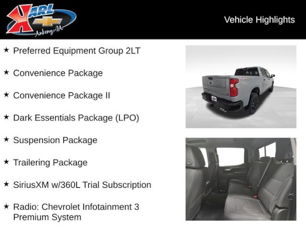 Factory MSRP: $67,650 $6,100 off MSRP! 10-Speed Automatic, 4WD, Jet Blk Clth Cloth, 10-Way Power Driver Seat w/Lumbar, 12.3 Multicolor Reconfigurable Digital Display, 120-Volt Bed Mounted Power Outlet, 120-Volt Interior Power Outlet, 2 USB Data Ports, 6-Speaker Audio System, All-Weather Floor Liner (LPO) (AAK), Apple CarPlay/Android Auto, Auto-Locking Rear Differential, Black Name Plates (LPO), Bluetooth® For Phone, Color-Keyed Carpeting Floor Covering, Convenience Package, Convenience Package II, Dark Essentials Package (LPO), Deep-Tinted Glass, Dual Rear USB Ports (Charge Only), Dual-Zone Automatic Climate Control, Electric Rear-Window Defogger, Electronic Cruise Control, Electronic Transmission Range Selector Shifter, EZ Lift Power Lock & Release Tailgate, Floor Mounted Center Console, Front Bucket Seats, Front LED Fog Lamps, HD Rear Vision Camera, Heated door mirrors, Heated Driver & Front Outboard Passenger Seats, Heated Power-Adjustable Outside Mirrors, Heated Steering Wheel, Heavy-Duty Air Filter, High Gloss Black Mirror Caps, Hill Descent Control, Hitch Guidance, Hitch Guidance w/Hitch View, In-Vehicle Trailering System App, Inside Rear-View Mirror w/Tilt, Integrated Trailer Brake Controller, IntelliBeam Automatic High Beam On/Off, Keyless Open & Start, LED Cargo Area Lighting, Manual Tilt/Telescoping Steering Column, Multi-Flex Tailgate, OnStar Services Capable, Performance Red Recovery Hooks, Power Front Windows w/Driver Express Up/Down, Power Front Windows w/Passenger Express Down, Power Rear Windows w/Express Down, Power Sliding Rear Window w/Rear Defogger, Preferred Equipment Group 2LT, Premium audio system: Chevrolet Infotainment 3 Premium, Premium Bose 7-Speaker Sound System, Radio: Chevrolet Infotainment 3 Premium System, Rear 60/40 Folding Bench Seat (Folds Up), Remote Vehicle Starter System, SiriusXM w/360L Trial Subscription, Split folding rear seat, Standard Tailgate, Steering Wheel Audio Controls, Suspension Package, Teen Driver, Theft Deterrent System (Unauthorized Entry), Tire Pressure Monitoring System, Trailering Package, Universal Home Remote, Wheels: 20 x 9 High Gloss Black Painted Alum, Wi-Fi Hot Spot Capable, Wireless Charging, Wrapped Steering Wheel.