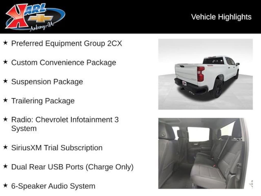 Factory MSRP: $57,490 $6,100 off MSRP! Priced below KBB Fair Purchase Price! 10-Speed Automatic, 4WD, Jet Blk Clth Cloth, 10-Way Power Driver Seat w/Lumbar, 120-Volt Bed Mounted Power Outlet, 120-Volt Interior Power Outlet, 3.5 Monochromatic Display Driver Info Center, 40/20/40 Front Split-Bench Seat, 6-Speaker Audio System, Apple CarPlay/Android Auto, Auto-Locking Rear Differential, Bluetooth® For Phone, Color-Keyed Carpeting Floor Covering, Custom Convenience Package, Deep-Tinted Glass, Dual Rear USB Ports (Charge Only), Electric Rear-Window Defogger, Electronic Cruise Control, EZ Lift Power Lock & Release Tailgate, Front Rubberized Vinyl Floor Mats, HD Rear Vision Camera, Heated door mirrors, Heavy-Duty Air Filter, Hill Descent Control, Hitch Guidance, IntelliBeam Automatic High Beam On/Off, LED Cargo Area Lighting, Manual Tilt Wheel Steering Column, OnStar Services Capable, Performance Red Recovery Hooks, Power Front Windows w/Driver Express Up/Down, Power Front Windows w/Passenger Express Down, Power Rear Windows w/Express Down, Preferred Equipment Group 2CX, Premium audio system: Chevrolet Infotainment 3, Radio: Chevrolet Infotainment 3 System, Rear 60/40 Folding Bench Seat (Folds Up), Rear Rubberized-Vinyl Floor Mats, Remote Keyless Entry, Remote Vehicle Starter System, SiriusXM Trial Subscription, Split folding rear seat, Standard Tailgate, Suspension Package, Teen Driver, Theft Deterrent System (Unauthorized Entry), Tire Pressure Monitoring System, Trailering Package, Wheels: 18 x 8.5 Black Painted Aluminum, Wi-Fi Hot Spot Capable.