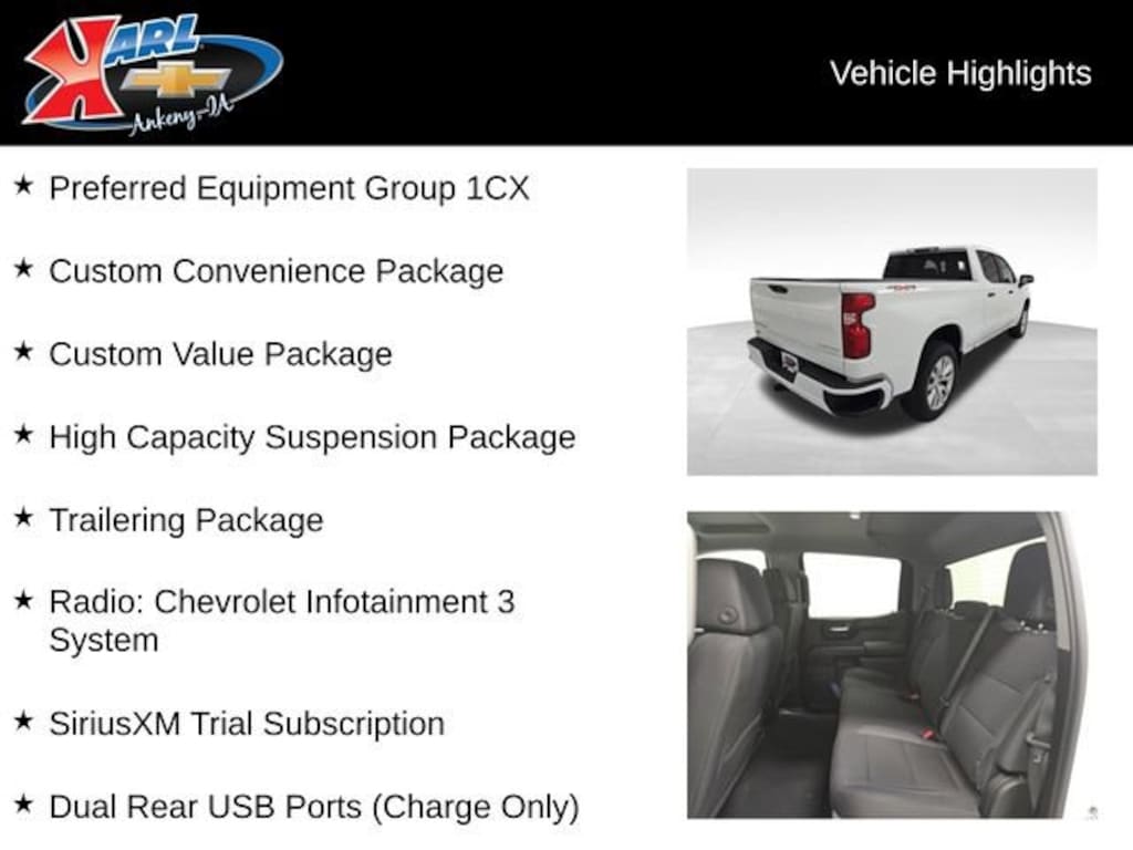Factory MSRP: $50,630 $5,350 off MSRP! Priced below KBB Fair Purchase Price! 8-Speed Automatic, 4WD, Black Cloth, 10-Way Power Driver Seat w/Lumbar, 120-Volt Bed Mounted Power Outlet, 120-Volt Interior Power Outlet, 3.5 Monochromatic Display Driver Info Center, 40/20/40 Front Split-Bench Seat, 6-Speaker Audio System, Apple CarPlay/Android Auto, Bluetooth® For Phone, Bumpers: body-color, Chevytec Spray-On Black Bedliner, Color-Keyed Carpeting Floor Covering, Custom Convenience Package, Custom Value Package, Deep-Tinted Glass, Dual Rear USB Ports (Charge Only), Electric Rear-Window Defogger, Electronic Cruise Control, EZ Lift Power Lock & Release Tailgate, Front Frame-Mounted Black Recovery Hooks, Front Rubberized Vinyl Floor Mats, HD Rear Vision Camera, Heated door mirrors, High Capacity Suspension Package, Hitch Guidance, IntelliBeam Automatic High Beam On/Off, LED Cargo Area Lighting, Manual Tilt Wheel Steering Column, OnStar Services Capable, Power Front Windows w/Driver Express Up/Down, Power Front Windows w/Passenger Express Down, Power Rear Windows w/Express Down, Preferred Equipment Group 1CX, Radio data system, Radio: Chevrolet Infotainment 3 System, Rear 60/40 Folding Bench Seat (Folds Up), Rear Rubberized-Vinyl Floor Mats, Remote Keyless Entry, Remote Vehicle Starter System, SiriusXM Trial Subscription, Split folding rear seat, Standard Tailgate, Teen Driver, Theft Deterrent System (Unauthorized Entry), Tire Pressure Monitoring System, Trailering Package, Wheels: 20 x 9 Bright Silver Painted Aluminum, Wi-Fi Hot Spot Capable.Recent Arrival!Summit White 2026 Chevrolet Silverado 1500 Custom 4D Crew Cab 2.7L I4 Turbocharged DOHC 16V LEV3-SULEV30 310hp 8-Speed Automatic 4WD Price includes: $1000 - GM Bonus Cash. Exp. 03/02/2026 $3000 - Chevrolet Consumer Cash Program. Exp. 03/02/2026