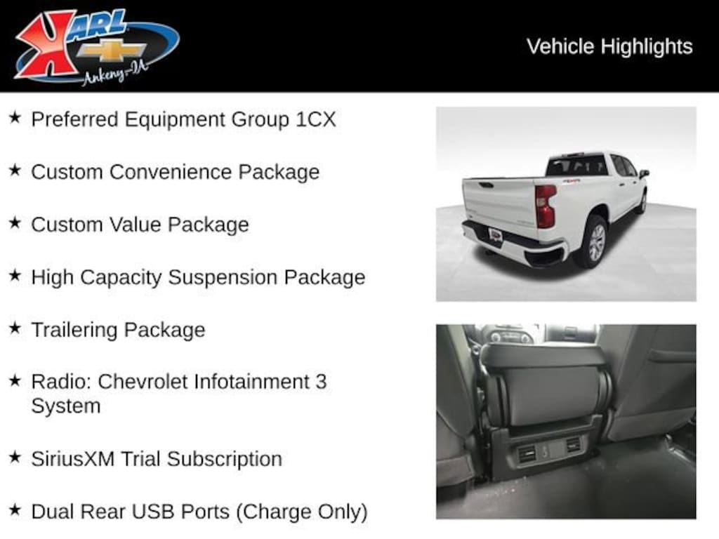 Factory MSRP: $50,030 $3,750 off MSRP! Priced below KBB Fair Purchase Price! 8-Speed Automatic, 4WD, Black Cloth, 10-Way Power Driver Seat w/Lumbar, 120-Volt Bed Mounted Power Outlet, 120-Volt Interior Power Outlet, 3.5 Monochromatic Display Driver Info Center, 40/20/40 Front Split-Bench Seat, 6-Speaker Audio System, Apple CarPlay/Android Auto, Bluetooth® For Phone, Bumpers: body-color, Chevytec Spray-On Black Bedliner, Color-Keyed Carpeting Floor Covering, Custom Convenience Package, Custom Value Package, Deep-Tinted Glass, Dual Rear USB Ports (Charge Only), Electric Rear-Window Defogger, Electronic Cruise Control, EZ Lift Power Lock & Release Tailgate, Front Frame-Mounted Black Recovery Hooks, Front License Plate Kit, Front Rubberized Vinyl Floor Mats, HD Rear Vision Camera, Heated door mirrors, High Capacity Suspension Package, Hitch Guidance, IntelliBeam Automatic High Beam On/Off, LED Cargo Area Lighting, Manual Tilt Wheel Steering Column, OnStar Services Capable, Power Front Windows w/Driver Express Up/Down, Power Front Windows w/Passenger Express Down, Power Rear Windows w/Express Down, Preferred Equipment Group 1CX, Premium audio system: Chevrolet Infotainment 3, Radio: Chevrolet Infotainment 3 System, Rear 60/40 Folding Bench Seat (Folds Up), Rear Rubberized-Vinyl Floor Mats, Remote Keyless Entry, Remote Vehicle Starter System, SiriusXM Trial Subscription, Split folding rear seat, Standard Tailgate, Teen Driver, Theft Deterrent System (Unauthorized Entry), Tire Pressure Monitoring System, Trailering Package, Wheels: 20 x 9 Bright Silver Painted Aluminum, Wi-Fi Hot Spot Capable.Recent Arrival!Summit White 2026 Chevrolet Silverado 1500 Custom 4D Crew Cab 2.7L I4 Turbocharged DOHC 16V LEV3-SULEV30 310hp 8-Speed Automatic 4WD Price includes: $1000 - GM Bonus Cash. Exp. 11/03/2025 $1750 - Chevrolet Consumer Cash Program. Exp. 11/03/2025