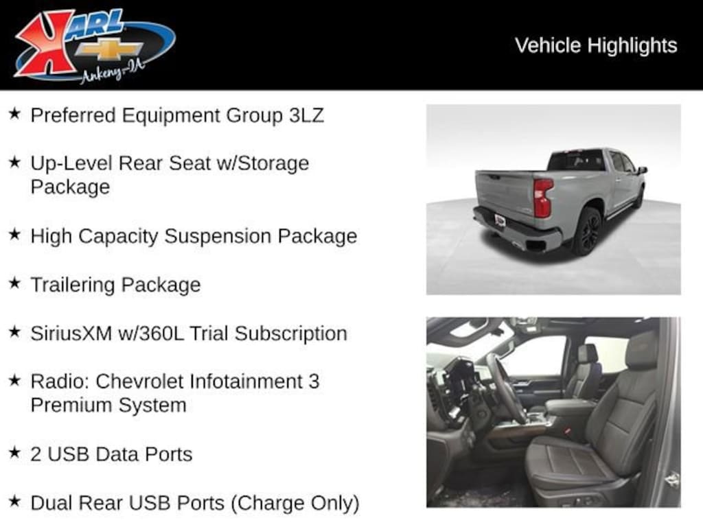 Certification Program Details: Karl Chevrolet of Ankeny, The Nation's #1 CarBravo Certified Dealer! Every CarBravo Certified vehicle includes: Comprehensive 126-Point Inspection Professionally inspected by factory-trained technicians to meet strict mechanical, safety, and cosmetic standards. 12-Month / 12,000-Mile Bumper-to-Bumper Limited Warranty Enjoy added peace of mind with extensive coverage from the day you drive off the lot. 24/7 Roadside Assistance & Courtesy Transportation Flat tire? Dead battery? Need a tow? You're covered anywhere, anytime throughout the warranty period. Vehicle History & Title Guarantee Clean title, completed safety recalls, and a full CARFAX® or AutoCheck® report provided for complete transparency. 10-Day / 500-Mile Exchange Promise If you don't absolutely love it, bring it back and exchange it no hassle, no stress. Experience peace of mind and premium protection exclusively from Karl Chevrolet of Ankeny, the Nation's #1 CarBravo Dealer! 6.2L V8 (EcoTec3) High Capacity Suspension Package Preferred Equipment Group 3LZ Trailering Package Up-Level Rear Seat w/Storage Package 2 USB Data Ports Dual Rear USB Ports (Charge Only) Premium Bose 7-Speaker Sound System 120-Volt Bed Mounted Power Outlet 120-Volt Interior Power Outlet Power Tailgate Perimeter Lighting Adaptive Cruise Control Bed View Camera Heated Steering WheelThis 2026 Chevrolet Silverado 1500 High Country is a true powerhouse, combining exceptional capability with premium comfort and convenience features. Equipped with the robust 6.2L EcoTec3 V8 engine, this Silverado delivers 420 horsepower and 460 lb-ft of torque, giving you the muscle to tackle any task with ease. The 10-speed automatic transmission and 4-wheel drive system ensure seamless power delivery and confident handling in all conditions.Beyond its impressive performance, this Silverado High Country is packed with a wealth of premium features designed to elevate your driving experience. The Bose 7-speaker sound system and Chevrolet Infotainment 3 Premium system with SiriusXM and Apple CarPlay/Android Auto integration provide exceptional entertainment and connectivity. Heated and ventilated front seats, a heated steering wheel, and dual-zone automatic climate control ensure unparalleled comfort, while the power tailgate, 120-volt power outlets, and Bed View Camera enhance the utility of the spacious cargo bed.Safety and driver assistance technologies are also a priority, with features like Adaptive Cruise Control, Forward Collision Alert, Lane Keep Assist, and Rear Pedestrian Alert keeping you and your passengers secure on the road. The Silverado's robust build and advanced safety systems provide a reassuring sense of protection, giving you the confidence to tackle any adventure.With its exceptional capability, premium features, and advanced safety technologies, this 2026 Chevrolet Silverado 1500 High Country is the perfect companion for your next big project or family excursion. Experience the power and refinement of this remarkable vehicle for yourself by scheduling a test drive at Karl Chevrolet of Ankeny today.At Karl Chevrolet we want to help you find the best new or used car in Ankeny that suits your needs. When you buy a new car at Karl Chevrolet you know you're finding a vehicle you can rely on. We have a great selection of Platinum Quality Pre-Owned Vehicles. We also pride ourselves in creating a friendly atmosphere and a reliable Dealership that you can trust. Call us and our experts will be glad to help you! (515) 299-4300. *Equipment and options are generated by a 3rd party vendor, exact vehicle options may vary. Please see a salesperson for complete details and vehicle information. Price includes: $1750 - Chevrolet Bonus Cash. Exp. 03/02/2026 $2500 - Chevrolet Consumer Cash Program. Exp