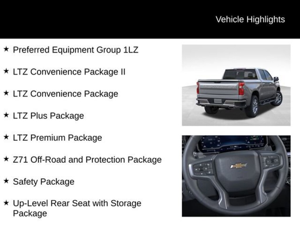 The 2026 Chevrolet Silverado 1500 LTZ is a true workhorse, built to take on any challenge with power, capability, and style. This exceptional truck is the perfect companion for your adventures, whether you're hauling heavy loads, towing your toys, or navigating off-road terrain.The Silverado 1500 LTZ boasts an impressive array of features, including:- High Capacity Suspension Package- LTZ Convenience Package- LTZ Convenience Package II- LTZ Plus Package- LTZ Premium Package- Preferred Equipment Group 1LZ- Safety Package- Trailering Package- Up-Level Rear Seat with Storage Package- Z71 Off-Road and Protection Package- Z71 Off-Road PackagePowered by the robust EcoTec3 5.3L V8 engine and equipped with a 10-Speed Automatic transmission, this 4WD Silverado delivers an impressive blend of power and efficiency, with an EPA-estimated 15 city/20 highway MPG.The exterior of the Silverado 1500 LTZ is nothing short of stunning, with a sleek Gray finish, chrome accents, and a bold presence that commands attention. Step inside and you'll be greeted by a refined and well-appointed cabin, featuring premium Bose audio, wireless charging, and a host of advanced technology and safety features, including Adaptive Cruise Control, Rear Pedestrian Alert, and HD Surround Vision.Whether you're tackling tough jobs or seeking a capable and comfortable daily driver, the 2026 Chevrolet Silverado 1500 LTZ is the perfect choice. Its uncompromising blend of power, utility, and premium amenities make it a standout in the full-size truck segment.At Karl Chevrolet Stuart, we want to help you find the best new or used car in Stuart that suits your needs. When you buy a new car at Karl Chevrolet Stuart, you know you're finding a vehicle you can rely on. We have a great selection of CarBravo Quality Pre-Owned Vehicles. We also pride ourselves in creating a friendly atmosphere and a reliable Dealership that you can trust. Call us and our experts will be glad to help you! (515) 523-1201. *Equipment and options are generated by a 3rd party vendor, exact vehicle options may vary. Please see a salesperson for complete details and vehicle information. Price includes: $4250 - Chevrolet Consumer Cash Program. Exp. 04/30/2026 $500 - Chevrolet Bonus Cash. Exp. 04/30/2026