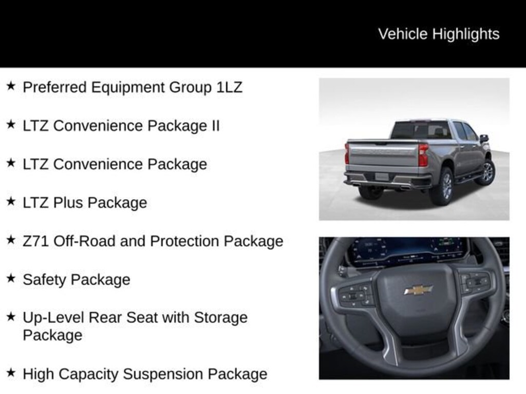 Elevate your driving experience with the remarkable 2026 Chevrolet Silverado 1500 LTZ. This exceptional full-size pickup is engineered to conquer the road and tackle any adventure with unparalleled capability and style.- Premium Bose 7-Speaker Sound System- 120-Volt Bed Mounted Power Outlet- Adaptive Cruise Control- Chevytec Spray-on Black Bedliner- Heated and Ventilated Front Seats- Trailer Camera Provisions- Wireless Charging- Integrated Trailer Brake Controller- Hitch Guidance with Hitch View- Wheels: 20 x 9 Sterling Silver Painted AluminumPowered by the robust EcoTec3 5.3L V8 engine and paired with a smooth-shifting 10-Speed Automatic transmission, this Silverado 1500 LTZ delivers impressive performance and efficiency. With its advanced 4WD system, you'll conquer any terrain with confidence, whether tackling off-road adventures or towing heavy loads.Step inside the meticulously crafted cabin and experience the ultimate in comfort and convenience. The 12.3 Multicolor Reconfigurable Digital Display, Chevrolet Infotainment 3 Premium System, and premium Bose audio create an immersive driving experience. Dual-zone automatic climate control, heated and ventilated front seats, and a heated steering wheel ensure you and your passengers travel in supreme comfort.Designed with your safety in mind, the Silverado 1500 LTZ is equipped with a suite of advanced driver-assistance technologies, including Adaptive Cruise Control, Automatic Emergency Braking, Lane Keep Assist, and more. These features work seamlessly to help keep you and your loved ones secure on the road.Whether you're hauling heavy cargo, towing a trailer, or seeking a capable and refined daily driver, the 2026 Chevrolet Silverado 1500 LTZ is the perfect companion for your adventures. Experience the power, technology, and premium craftsmanship that set this truck apart.At Karl Chevrolet Stuart, we want to help you find the best new or used car in Stuart that suits your needs. When you buy a new car at Karl Chevrolet Stuart, you know you're finding a vehicle you can rely on. We have a great selection of CarBravo Quality Pre-Owned Vehicles. We also pride ourselves in creating a friendly atmosphere and a reliable Dealership that you can trust. Call us and our experts will be glad to help you! (515) 523-1201. *Equipment and options are generated by a 3rd party vendor, exact vehicle options may vary. Please see a salesperson for complete details and vehicle information. Price includes: $4250 - Chevrolet Consumer Cash Program. Exp. 04/30/2026 $500 - Chevrolet Bonus Cash. Exp. 04/30/2026