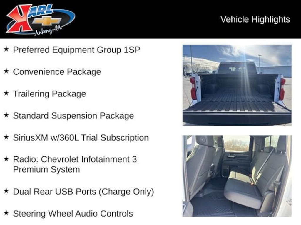 Experience the Unparalleled Capabilities of the 2026 Chevrolet Silverado 1500 RSTElevate your driving experience with the remarkable 2026 Chevrolet Silverado 1500 RST. This powerhouse of a truck is engineered to conquer any terrain, offering exceptional performance and uncompromising style.- Z71 Off-Road and Protection Package- All Star Edition Plus- 5.3L EcoTec3 V8 Engine- Black Tubular Assist Steps- Dark Essentials PackageDesigned to tackle the toughest challenges, the Silverado 1500 RST is equipped with a robust 5.3L EcoTec3 V8 engine that delivers an impressive 355 horsepower and 383 lb-ft of torque. Paired with a smooth-shifting 10-speed automatic transmission and capable 4-wheel drive system, this truck is ready to take on any adventure.Elevate your driving experience with the Silverado 1500 RST's impressive array of premium features. Enjoy the convenience of keyless entry and start, the comfort of heated front seats and a heated steering wheel, and the advanced technology of the 12.3-inch reconfigurable digital display and Chevrolet Infotainment 3 Premium system with Apple CarPlay and Android Auto integration.Safety is also a top priority in the Silverado 1500 RST. With advanced driver-assistance technologies like Automatic Emergency Braking, Forward Collision Alert, and Lane Keep Assist, you can navigate the road with confidence.Whether you're tackling rugged terrain or simply commuting in style, the 2026 Chevrolet Silverado 1500 RST is the perfect companion. Its bold, distinctive styling and exceptional capabilities make it a true standout in the full-size truck segment.Experience the unparalleled power and versatility of the 2026 Chevrolet Silverado 1500 RST. Visit our showroom today and let our knowledgeable sales team guide you through all the features and capabilities that make this truck a true force to be reckoned with.At Karl Chevrolet we want to help you find the best new or used car in Ankeny that suits your needs. When you buy a new car at Karl Chevrolet you know you're finding a vehicle you can rely on. We have a great selection of Platinum Quality Pre-Owned Vehicles. We also pride ourselves in creating a friendly atmosphere and a reliable Dealership that you can trust. Call us and our experts will be glad to help you! (515) 299-4300. *Equipment and options are generated by a 3rd party vendor, exact vehicle options may vary. Please see a salesperson for complete details and vehicle information. Price includes: $1500 - Chevrolet Bonus Cash. Exp. 03/02/2026 $3250 - Chevrolet Consumer Cash Program. Exp. 03/02/2026