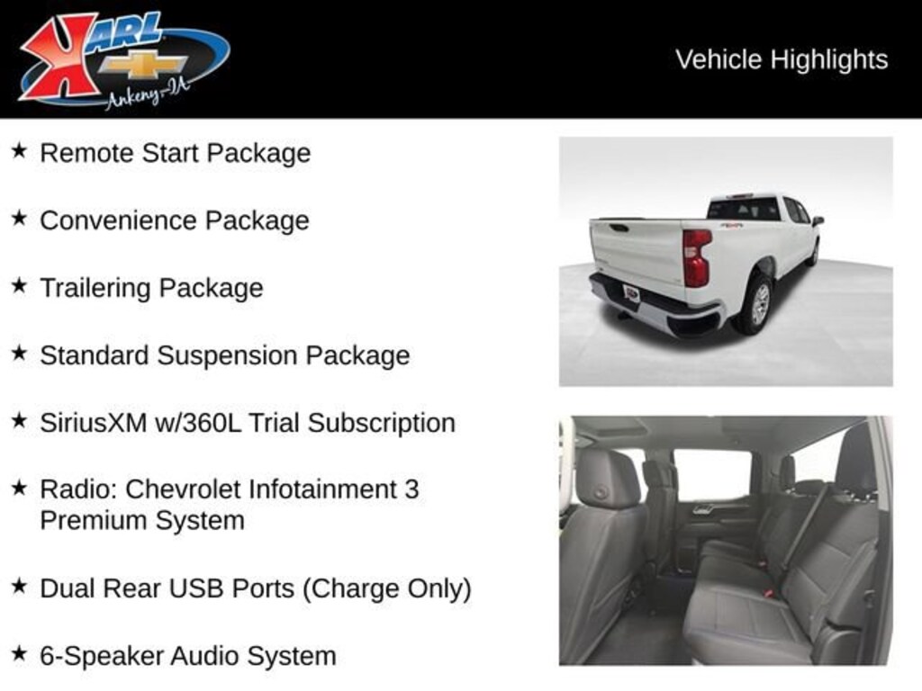 Factory MSRP: $58,590 $5,750 off MSRP! Priced below KBB Fair Purchase Price! 10-Speed Automatic, 4WD, Jet Blk Clth Cloth, 10-Way Power Driver Seat w/Lumbar, 12.3 Multicolor Reconfigurable Digital Display, 120-Volt Bed Mounted Power Outlet, 120-Volt Interior Power Outlet, 40/20/40 Front Split-Bench Seat, 6-Speaker Audio System, Air Conditioning, All-Star Edition, Automatic temperature control, Brake assist, Cloth Seat Trim, Color-Keyed Carpeting Floor Covering, Convenience Package, Deep-Tinted Glass, Driver door bin, Dual front impact airbags, Dual Rear USB Ports (Charge Only), Dual-Zone Automatic Climate Control, Electric Rear-Window Defogger, Electronic Stability Control, Emergency communication system: OnStar, Following Distance Indicator, Front anti-roll bar, Front Center Armrest w/Storage, Front dual zone A/C, Front Pedestrian Braking, Front reading lights, HD Rear Vision Camera, Heated door mirrors, Heated Driver & Front Outboard Passenger Seats, Heated front seats, Heated Power-Adjustable Outside Mirrors, Heated Steering Wheel, Hitch Guidance, Inside Rear-View Mirror w/Tilt, Keyless Open & Start, Lane Keep Assist w/Lane Departure Warning, LED Cargo Area Lighting, Manual Tilt/Telescoping Steering Column, OnStar Services Capable, Outside temperature display, Power driver seat, Power Front Windows w/Driver Express Up/Down, Power Front Windows w/Passenger Express Down, Power Rear Windows w/Express Down, Radio data system, Radio: Chevrolet Infotainment 3 Premium System, Rear 60/40 Folding Bench Seat (Folds Up), Rear step bumper, Rear window defroster, Remote keyless entry, Remote Start Package, Remote Vehicle Starter System, SiriusXM w/360L Trial Subscription, Standard Suspension Package, Theft Deterrent System (Unauthorized Entry), Tire Pressure Monitoring System, Trailering Package, Wheels: 17 x 8 Bright Silver Painted Aluminum, Wi-Fi Hot Spot Capable, Wrapped Steering Wheel.