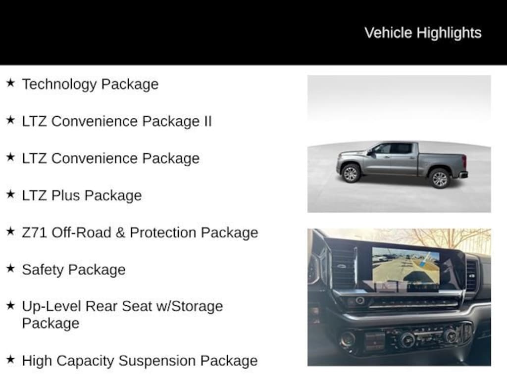 Factory MSRP: $68,285 $9,732 off MSRP! 10-Way Power Driver Seat w/Lumbar, 12.3 Multicolor Reconfigurable Digital Display, 120-Volt Bed Mounted Power Outlet, 120-Volt Interior Power Outlet, 15 Diagonal Multicolor Head-Up Display, 2 USB Data Ports, 2nd Row Heated Outboard Seats, Adaptive Cruise Control, Air Conditioning, All-Weather Floor Liner (LPO) (AAK), AM/FM radio: SiriusXM with 360L, Automatic temperature control, Bed View Camera, Bluetooth® For Phone, Brake assist, Chevytec Spray-On Black Bedliner, Color-Keyed Carpeting Floor Covering, Deep-Tinted Glass, Driver door bin, Dual Exhaust w/Black Exhaust Tips, Dual Exhaust w/Polished Outlets, Dual front impact airbags, Dual Rear USB Ports (Charge Only), Electric Rear-Window Defogger, Electronic Cruise Control, Electronic Stability Control, Electronic Transmission Range Selector Shifter, Emergency communication system: OnStar, Floor Mounted Center Console, Front Center Armrest, Front dual zone A/C, Front Pedestrian Braking, Front Rain-Sensing Wipers, Front reading lights, Front wheel independent suspension, HD Surround Vision, Heated Driver & Front Outboard Passenger Seats, Heated front seats, Heated steering wheel, Heavy-Duty Air Filter, High Capacity Suspension Package, Hill Descent Control, Hitch Guidance w/Hitch View, Illuminated entry, In-Vehicle Trailering System App, Integrated Trailer Brake Controller, Keyless Open & Start, LED Cargo Area Lighting, Low tire pressure warning, LTZ Convenience Package, LTZ Convenience Package II, LTZ Plus Package, Multi-Flex Tailgate, Off-Road Suspension, OnStar Services Capable, Outside Heated Power-Adjustable Mirrors, Outside temperature display, Perforated Leather-Appointed Front Seat Trim, Perimeter Lighting, Power Front Passenger Windows w/Express Up/Down, Power Rear Windows w/Express Down, Power Sliding Rear Window w/Rear Defogger, Power steering, Power Tailgate, Power Tilt & Telescoping Steering Column, Premium audio system: Chevrolet Infotainment 3 Premium, Premium Bose 7-Speaker Sound System, Radio: Chevrolet Infotainment 3 Premium System, Rain sensing wipers, Rear Camera Mirror, Rear Cross Traffic Braking, Rear Pedestrian Alert, Rear Rubberized-Vinyl Floor Mats, Rear step bumper, Rear Wheelhouse Liners, Rear window defroster, Remote keyless entry, Remote Vehicle Starter System, Safety Alert Seat, Safety Package, SiriusXM w/360L Trial Subscription, Technology Package, Trailer Camera Provisions, Trailer Side Blind Zone Alert, Trailering Package, Ultrasonic Front & Rear Park Assist, Universal Home Remote, Up-Level Rear Seat w/Storage Package, Ventilated Driver & Front Passenger Seats, Wheels: 20 x 9 Sterling Silver Painted Aluminum, Wi-Fi Hot Spot Capable, Wireless Charging, Z71 Off-Road & Protection Package, Z71 Off-Road Package.