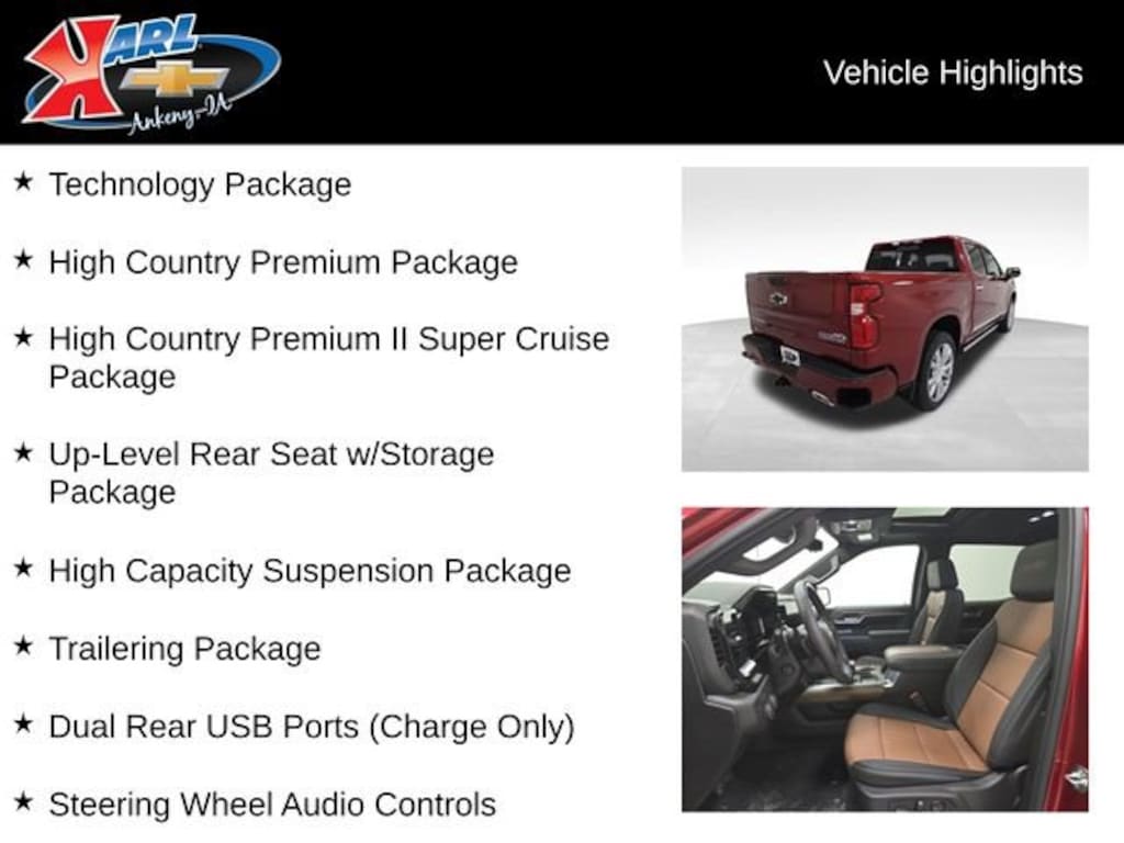 Factory MSRP: $80,210 $5,250 off MSRP! 10-Speed Automatic, 4WD, Jet Blk/Umber Perforated Leather, 10-Way Power Driver Seat w/Lumbar, 10-Way Power Passenger Seat Adjuster w/Lumbar, 12.3 Multicolor Reconfigurable Digital Display, 120-Volt Bed Mounted Power Outlet, 120-Volt Interior Power Outlet, 15 Diagonal Multicolor Head-Up Display, 2nd Row Heated Outboard Seats, 3 Years OnStar One, 7 Speakers, ABS brakes, Adaptive Ride Control Suspension, Air Conditioning, All-Weather Floor Liner (LPO), AM/FM radio: SiriusXM with 360L, Apple CarPlay/Android Auto, Automatic temperature control, Bluetooth® For Phone, Bodyside moldings, Brake assist, Chevytec Spray-On Black Bedliner, Color-Keyed Carpeting Floor Covering, Deep-Tinted Glass, Driver Memory, Driver vanity mirror, Dual Active Exhaust, Dual Exhaust w/Polished Outlets, Dual front side impact airbags, Dual Rear USB Ports (Charge Only), Electric Rear-Window Defogger, Electronic Stability Control, Emergency communication system: OnStar, Floor Mounted Center Console, Following Distance Indicator, Front anti-roll bar, Front Bucket Seats, Front Carpeted Floor Mats, Front dual zone A/C, Front LED Fog Lamps, Front Rain-Sensing Wipers, Front reading lights, Front wheel independent suspension, Garage door transmitter, Genuine wood door panel insert, HD Surround Vision, Heated door mirrors, Heated Driver & Front Outboard Passenger Seats, Heated front seats, Heated rear seats, Heated Steering Wheel, High Capacity Suspension Package, High Country Premium II Super Cruise Package, High Country Premium Package, Hitch Guidance, Hitch Guidance w/Hitch View, Integrated Trailer Brake Controller, IntelliBeam Automatic High Beam On/Off, Low tire pressure warning, Multi-Flex Tailgate, OnStar Services Capable, Outside Heated Power-Adjustable Mirrors, Outside temperature display, Power Front Passenger Windows w/Express Up/Down, Power Front Windows w/Driver Express Up/Down, Power passenger seat, Power Sunroof, Power Tailgate, Power Tilt & Telescoping Steering Column, Power-Retractable Assist Steps, Premium audio system: Chevrolet Infotainment 3 Premium, Radio data system, Rain sensing wipers, Rear Camera Mirror, Rear Carpeted Floor Mats, Rear Cross Traffic Braking, Rear Pedestrian Alert, Rear seat center armrest, Rear Wheelhouse Liners, Rear window defroster, Remote keyless entry, Remote Vehicle Starter System, Security system, Speed control, Split folding rear seat, Sport Wrapped Steering Wheel, Standard Tailgate, Steering Wheel Audio Controls, Steering wheel mounted audio controls, Super Cruise, Tachometer, Technology Package, Teen Driver, Trailer Side Blind Zone Alert, Trailering Package, Trip computer, Up-Level Rear Seat w/Storage Package, Ventilated Driver & Front Passenger Seats, Ventilated front seats, Wheels: 20 x 9 Painted Aluminum, Wheels: 22 x 9 Painted Aluminum, Wi-Fi Hot Spot Capable.Red 2026 Chevrolet Silverado 1500 High Country 4D Crew Cab EcoTec3 6.2L V8 10-Speed Automatic 4WD Price includes: $1750 - GM Bonus Cash. Exp. 01/02/2026 $2500 - Chevrolet Consumer Cash Program. Exp. 01/02/2026